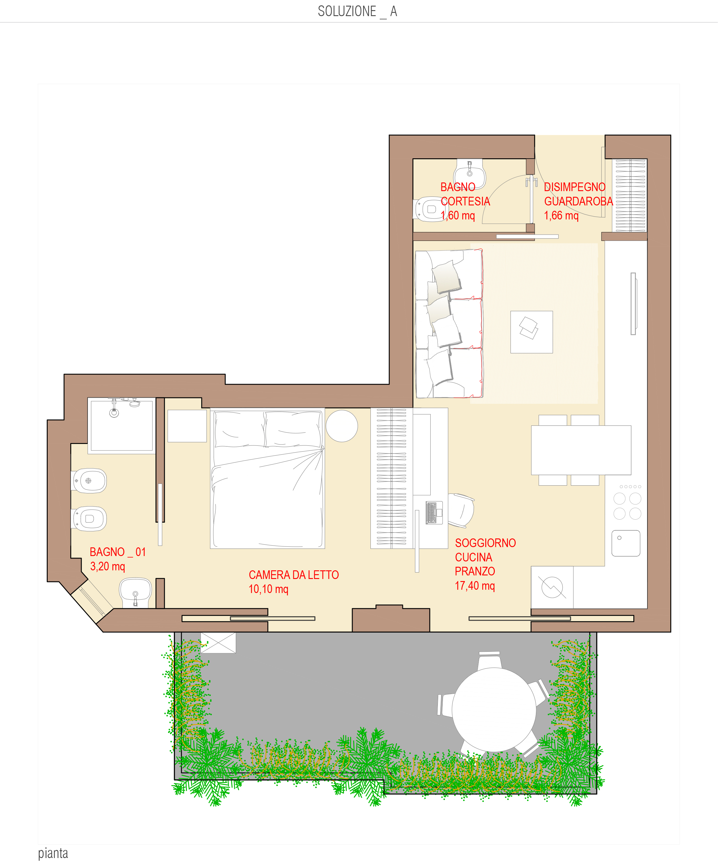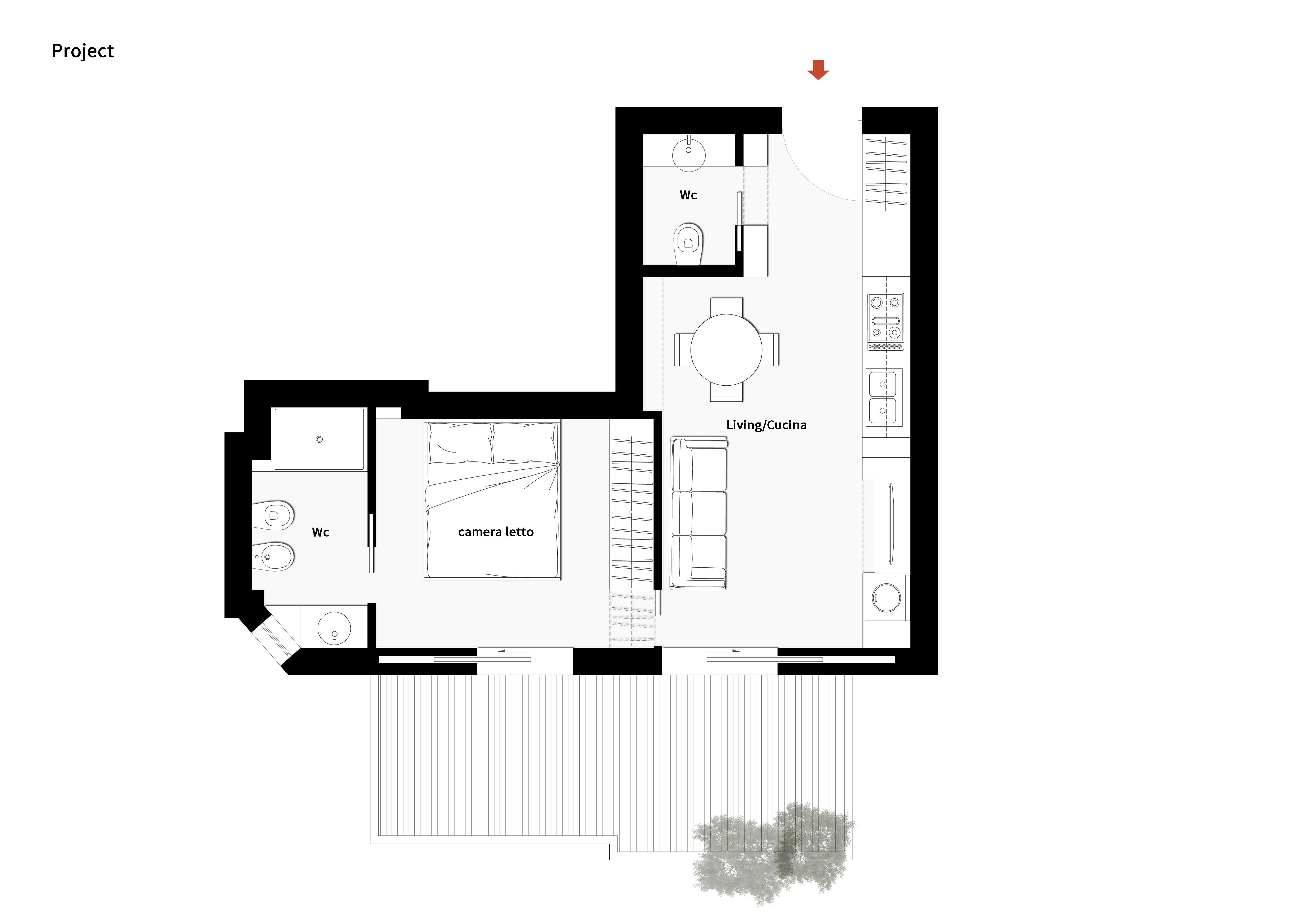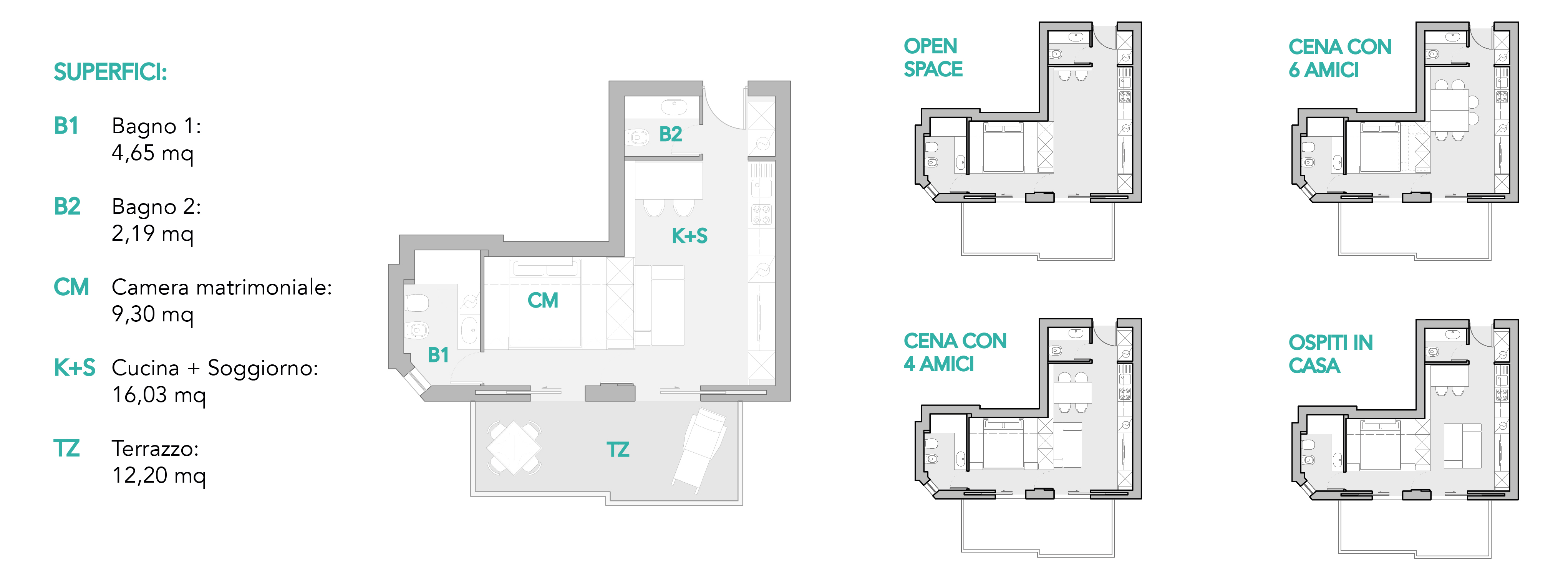 - Soluzione 'soggiorno+cucina' a scelta, sia separati che open space.