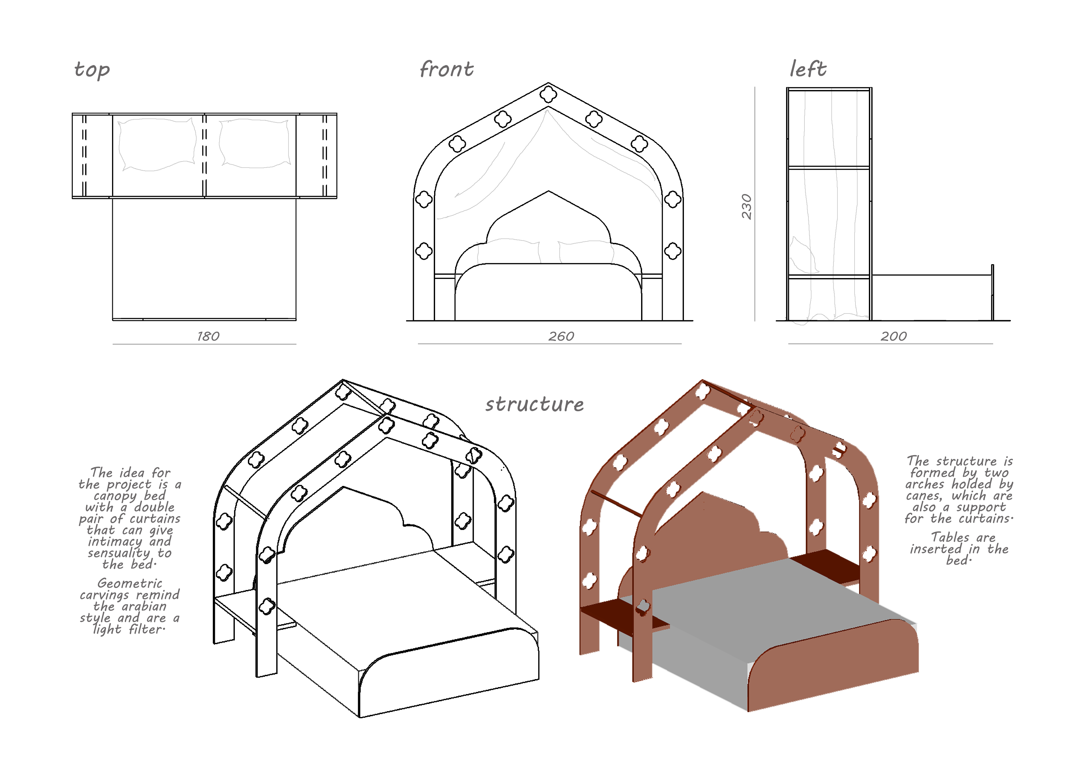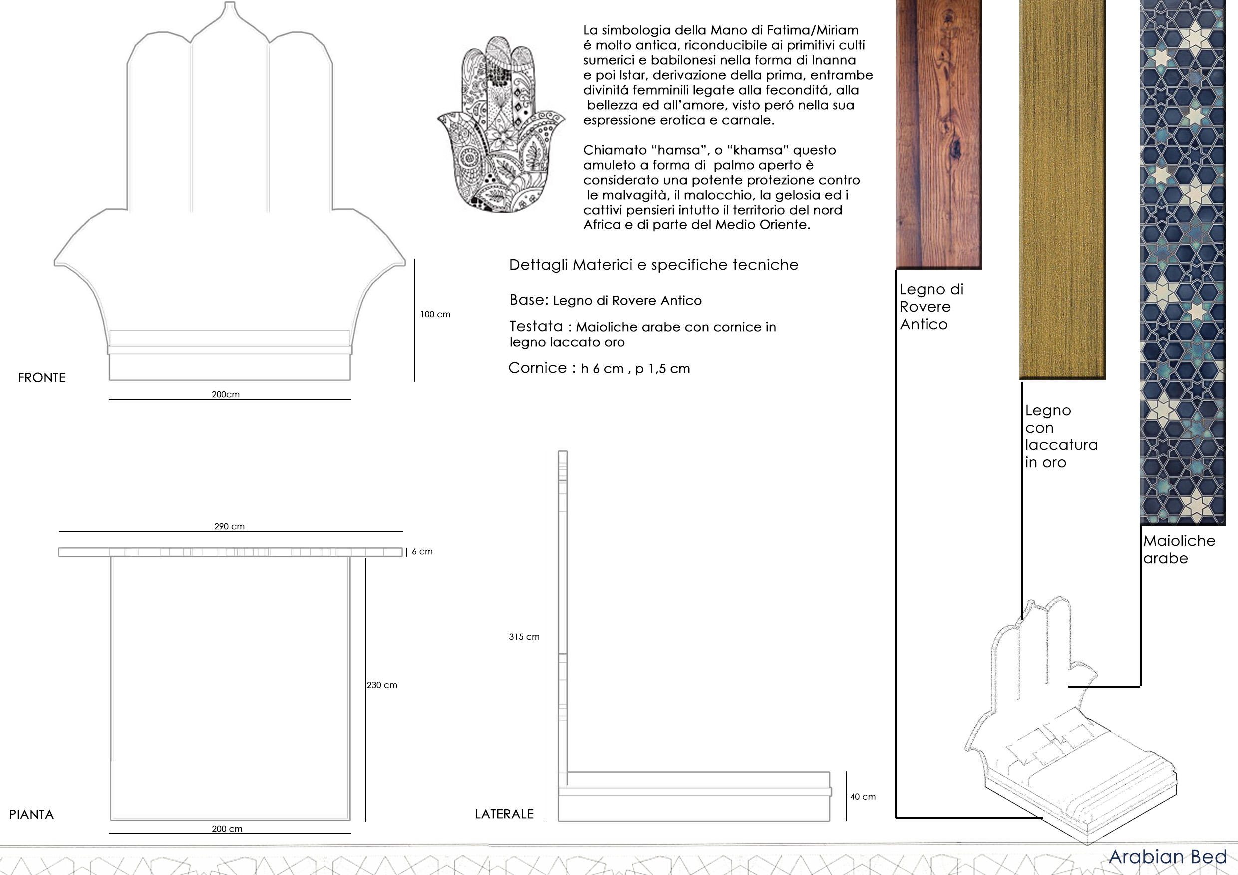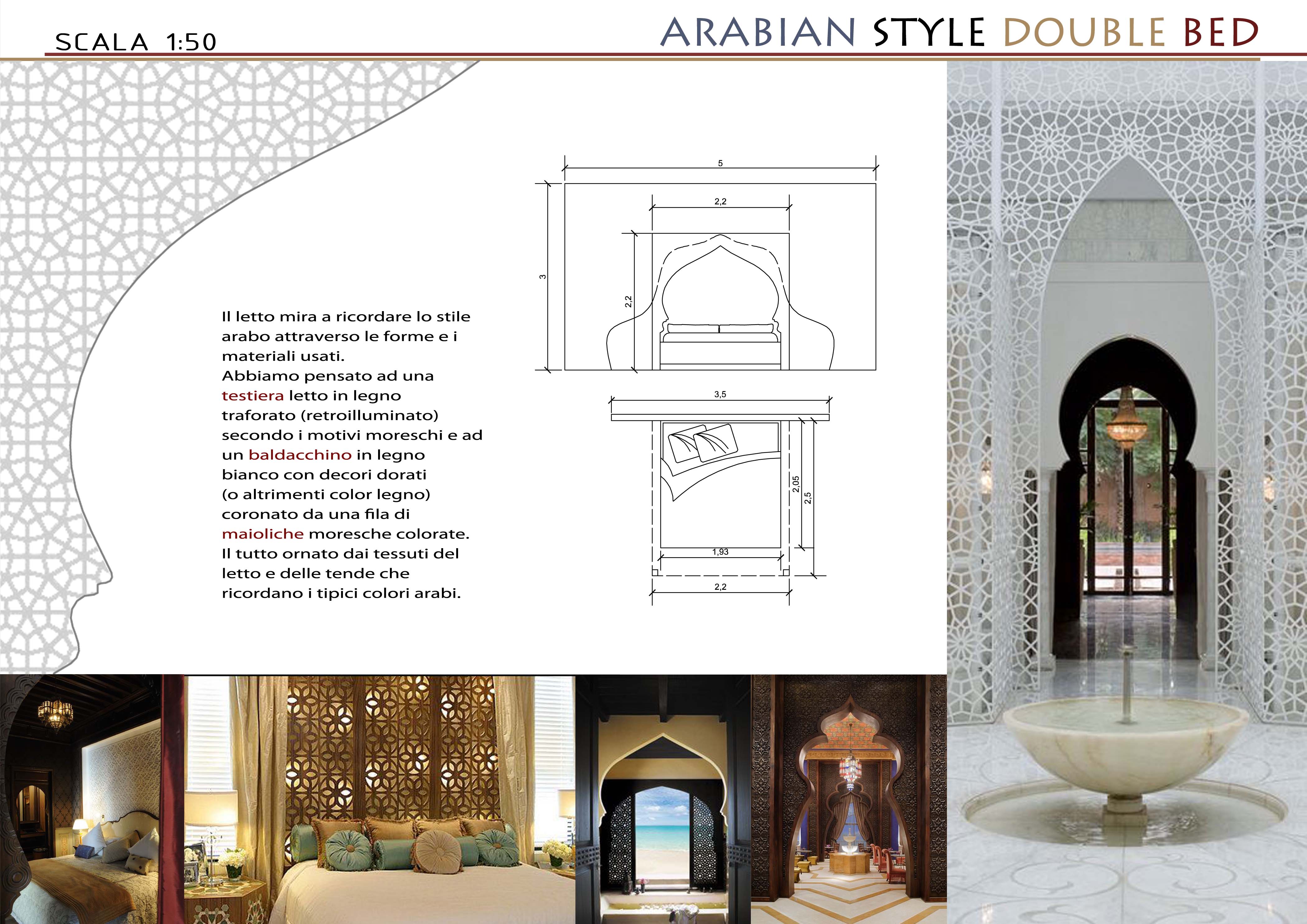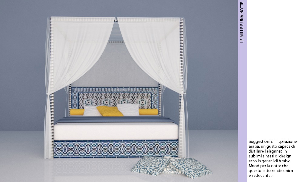 Si richiede il progetto di un letto matrimoniale per una camera da letto da mille e una notte, lussuosa e raffinata in stile arabo.