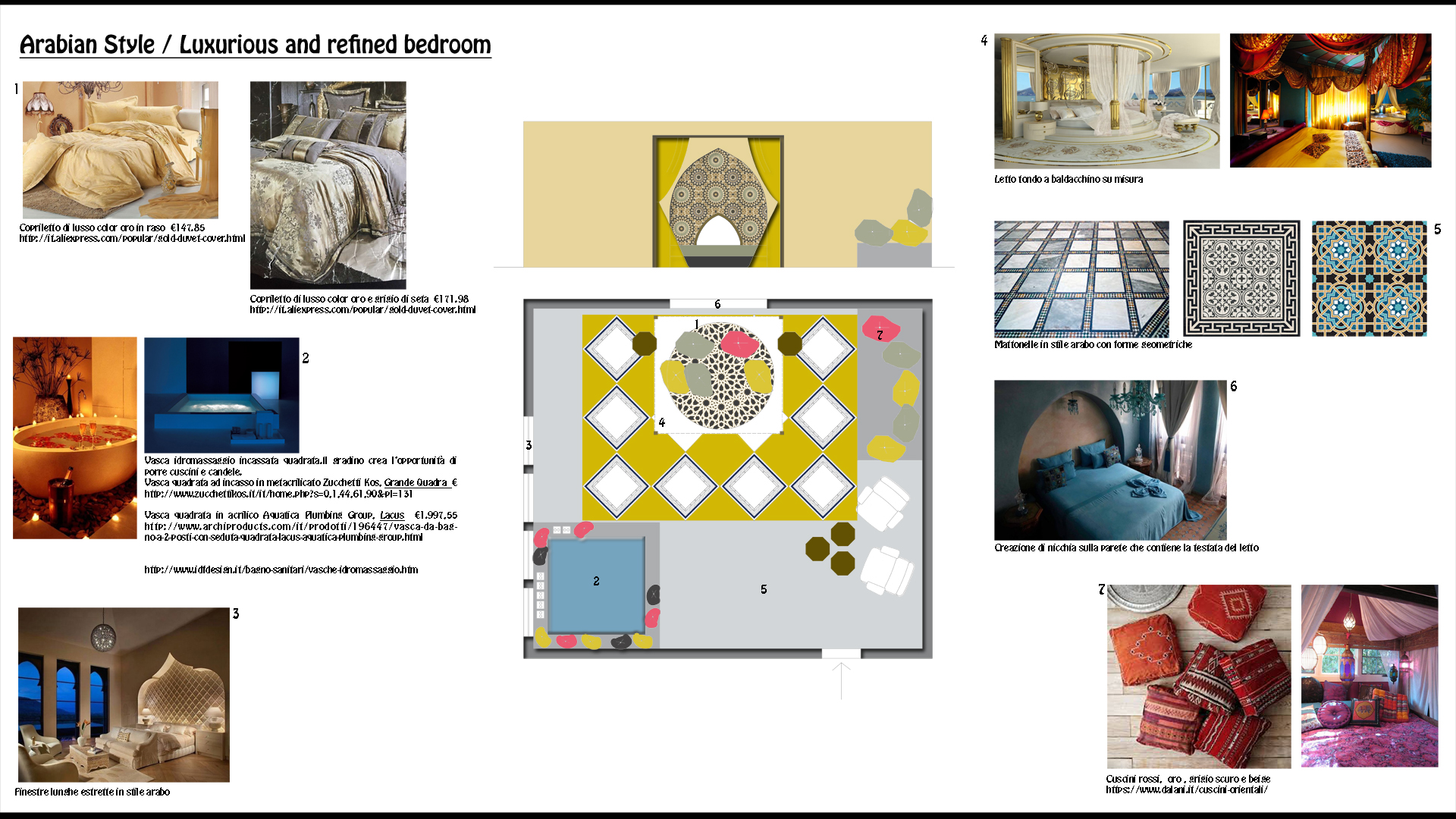 Si prediligono le tonalità tradizionalmente usate nello stile arabo: il blu, il rosso ruggine, il bianco e il giallo oro. Il progetto dovrà indicare dimensioni, materiali e colori.