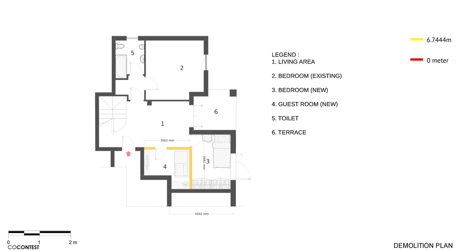 As it represent in the drawing, the wall only extends old wall (which has door frame to the terrace) and extend the wall that has entrance door.