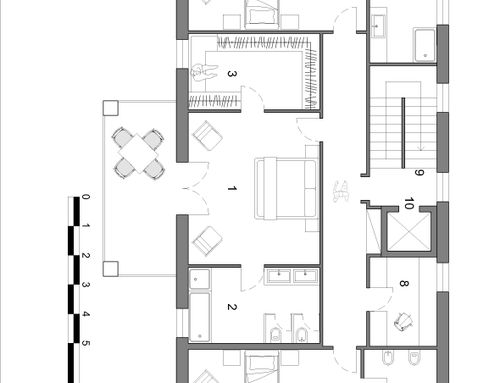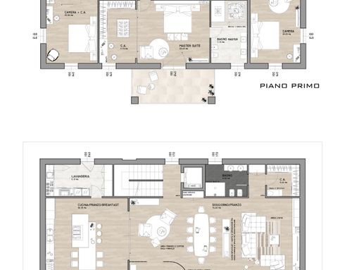 Il primo piano a cui si accede mediante ascensore o una scala a doppia rampa ospiterà invece la zona notte. La camera padronale idealmente dovrebbe essere quella centrale che sarà comunicante con un bagno e una cabina armadio. Anche qui vorrei prediligere dei colori naturali che rendano la camera accogliente. Il bagno padronale, se gli spazi lo permettono, dovrà ospitare oltre alla doccia walk in, una vasca da bagno. Vorrei un doppio lavandino con specchi lunghi e ovali e mobili con scanalature. La cabina armadio dovrà invece avere degli armadi chiusi (possibilmente con vetrate). Le altre due camere da letto avranno invece entrambe dei bagni en suite. Da ultimo, al primo piano si trova anche uno studio da utilizzare per lavoro e per l'archiviazione dei documenti.