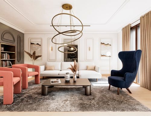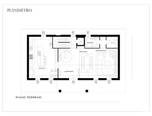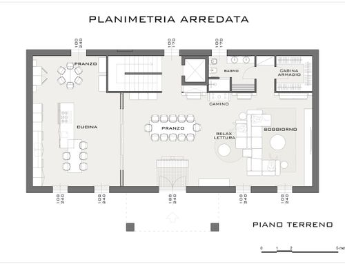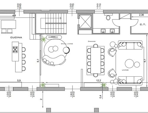Partendo dall'ingresso vorrei che ci fosse un tavolo d'appoggio con uno specchio. L'ingresso dovrebbe essere separato anche attraverso soluzioni "vedo non vedo" (ad esempio listelli di legno) dall'ampio living. Nella zona living, che dovrà essere il cuore nevralgico del progetto, vorrei ci fosse un grande tavolo da pranzo (che possa ospitare fino a 10/12 persone), una salotto "formale" con un grande camino e un'altra parte di salotto con tv e grandi librerie o mobili contenitori. Nel salotto vorrei che venissero utilizzati dei colori caldi come bianco, tortora, beige e marrone e che l'ambiente in generale si presenti come contemporaneo ed elegante al tempo stesso. Il living sarà poi diviso dalla cucina con una porta scorrevole vetrata. La cucina dovrà avere idealmente un'isola con degli sgabelli e un tavolo più piccolo per l'uso quotidiano. Per la cucina prediligo dei colori scuri come il grigio e il nero con inserti in marmo venato in verde e/o marrone o in legno.