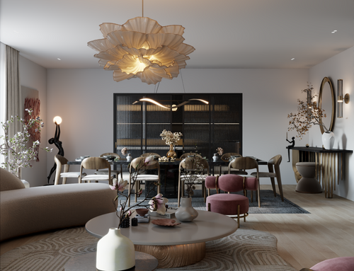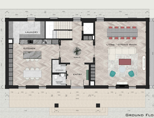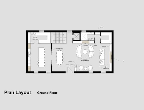 Let's start from the entrance where I'd like to find a desk/table and a mirror. The entrance has to be somehow separated by the living room by using for examples some wooden slats or similar. The living room (that to me is the most important part of this project) has to have a large dining room that can host up to 10/12 people, a formal living room with a fireplace and another section where I can place the TV and some big bookshelves or storage units. In this room I'd like to have warm colors such as  white, beige, taupe and brown. This part of the house has to be contemporary and elegant. The living is separated from the kitchen by a glass sliding door. The kitchen must host an island with some stools and some pendant lights over it and a smaller table (than the one in the living) to be used on a daily basis. I'd like to have a black/anthracite kitchen with some marble or wooden trims. The ground floor also features a bathroom (which I'd likee to be fancy and eclectic) and another room to be used for the storage of the outwear and shoes: this room is directly linked to the garage. Moreover, the ground floor features two "open" dividing walls that I'd like to be arch shaped.