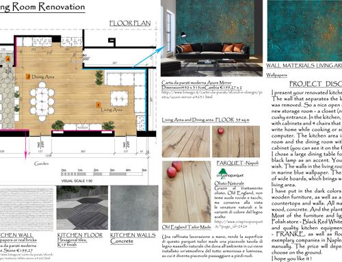I’d like the style to be informal, cosy and modern, without too much frills. I like warm colors, also dark ones but they have to be natural. I’d like the kitchen counters to be made of concrete or solid wood and resins. In the living area I’d like the parquet with wide planks, for the kitchen flooring something “cosy”. For the walls, I love wallpapers.