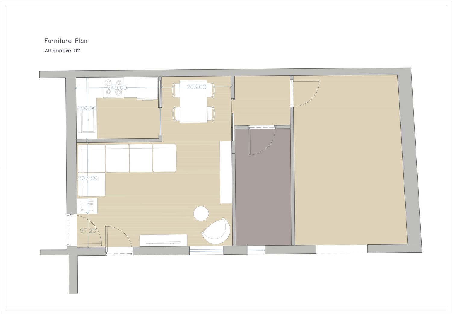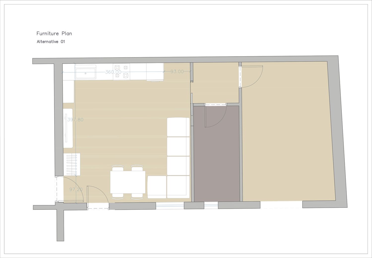 In Alternative 1, the kitchen is open, and all spaces โ the living area, dining area, kitchen, and entrance โ flow together as one continuous environment. The kitchen is arranged along the north wall so that the hood sits close to the existing vent and the sink is near the wastewater pipes. A wardrobe is placed next to the entrance. After the TV area, there is a cabinet for tableware, positioned next to the kitchen. The dining area is located by the windows and the terrace door, allowing the table to be extended easily whenever needed.