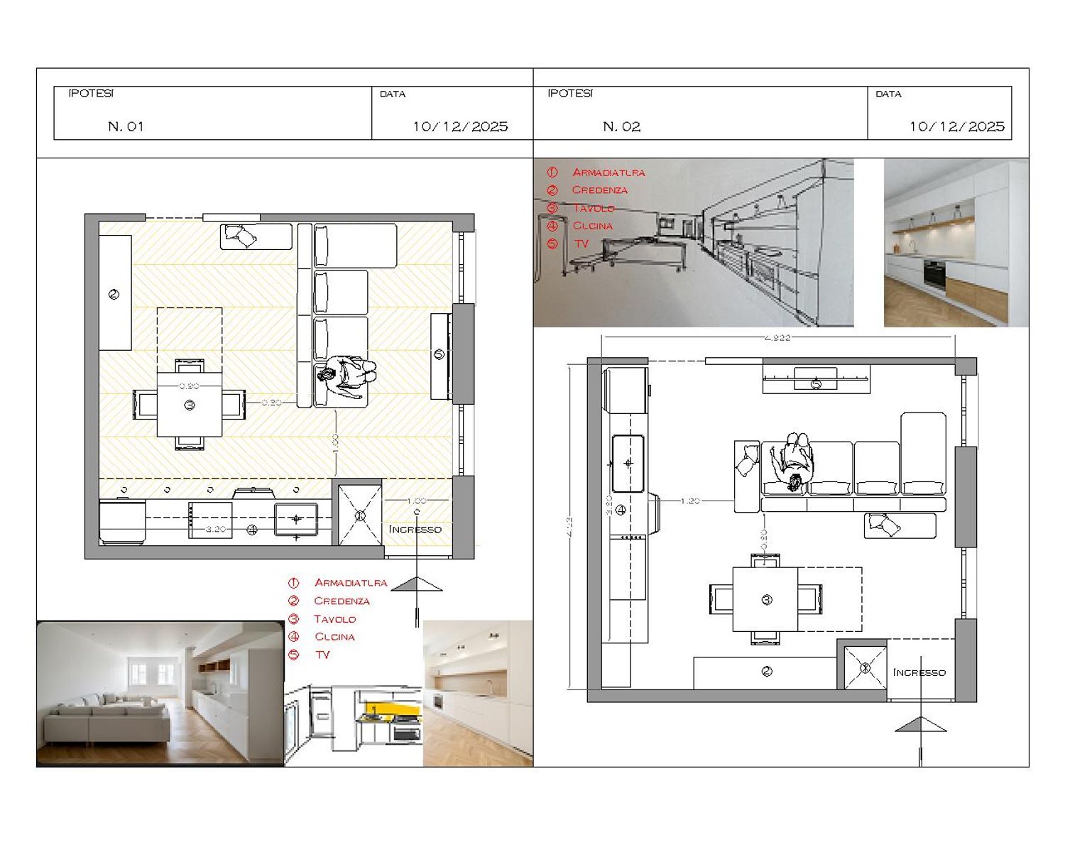 Valutate le possibilità, nell'arredare la sudetta stanza, partendo dal concetto di creare un filtro d'ingeresso nel quale collocare l'armadiatura, creando così un vero e proprio ingresso, filtro, sono state ipotizzate due soluzioni, l'una con un armadiatura più ampia che consente di nascondere completamente la cucina che risulta perfettamente incassata nella nicchia che si viene a creare, sulla quale ipotizzando una controsoffittatura per il passaggio delle esalazioni della cappa incassata, si ha la possibilità di inserire dei faretti o punti luce che illuminano direttamente la zona cucina.