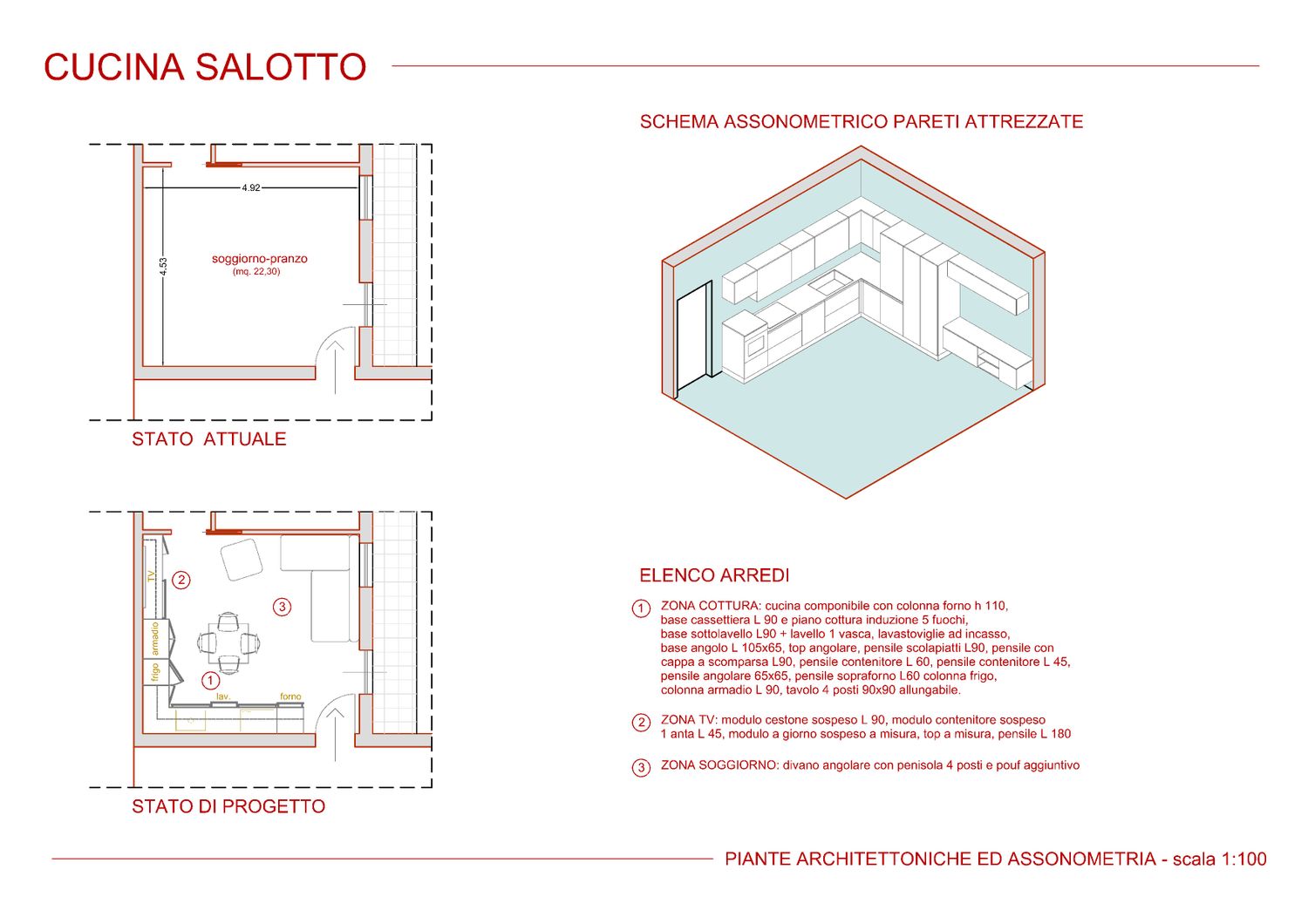 Si prevede di non stravolgere la conformazione spaziale ed impiantistica dell'ambiente posizionando la cucina a ridosso della parete contenente gli scarichi attuali e creando una continuità con la stessa aggiungendo mobili soggiorno della stessa tipologia di quelli componibili afferenti alla cucina.
