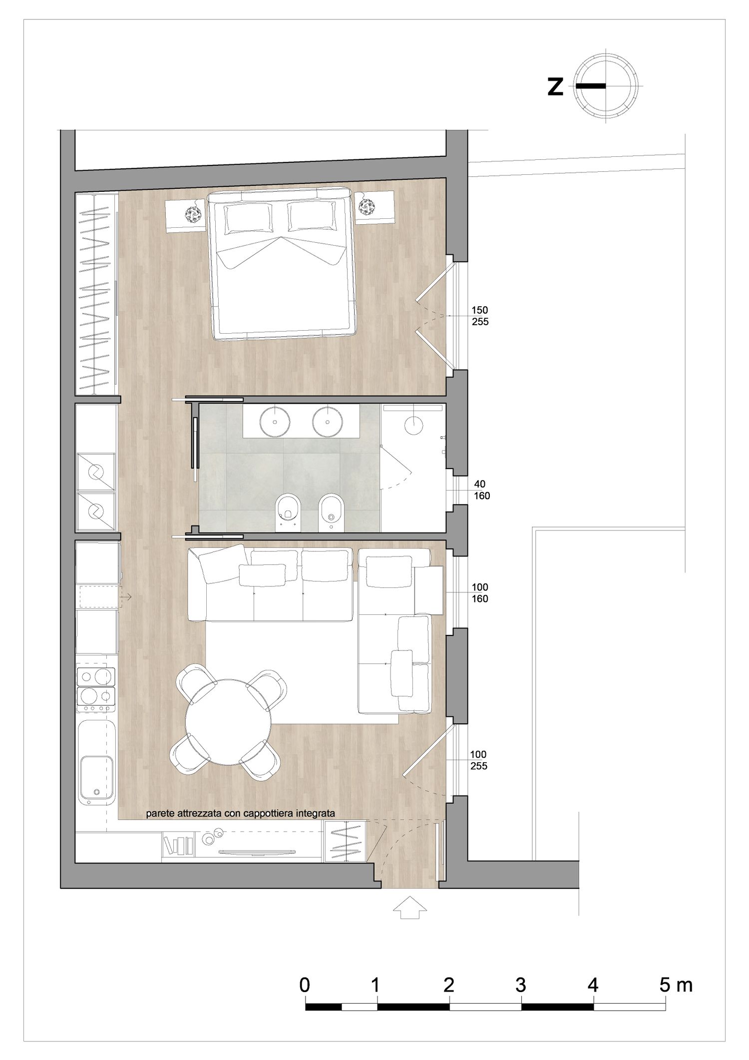 1. In questa variante, una parete angolare realizzata su misura e posizionata lungo i due lati ciechi (nord e ovest) contiene cucina, parete attrezzata/TV e cappottiera, chiudendosi con un sistema a ponte sopra la porta, dotato di spazio contenitore. Un divano modulare occupa l'angolo opposto, l'arredo è completato da un tavolo rotondo diam. 120 cm. Questa configurazione è la più conveniente, in quanto sfrutta le posizioni di tubazioni e cappa, richiedendo minimi spostamenti.