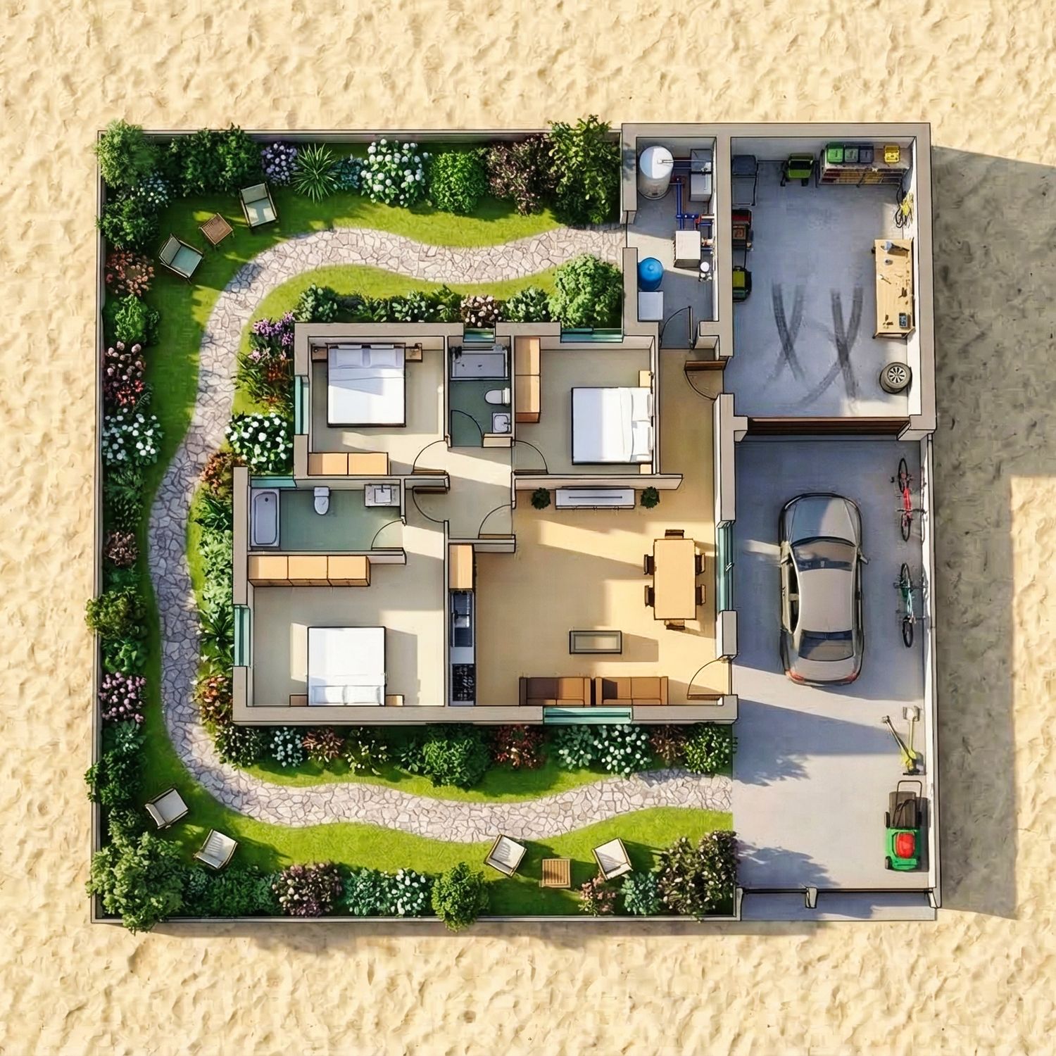 Benvenuti nel nostro ultimo concept di progettazione residenziale. Ponendo l'accento su una qualità superiore e su un'attenta disposizione degli spazi, questa planimetria è stata meticolosamente elaborata per coniugare una vita familiare funzionale con una perfetta continuità tra interni ed esterni, massimizzando al contempo il flusso di luce naturale in tutta la casa.