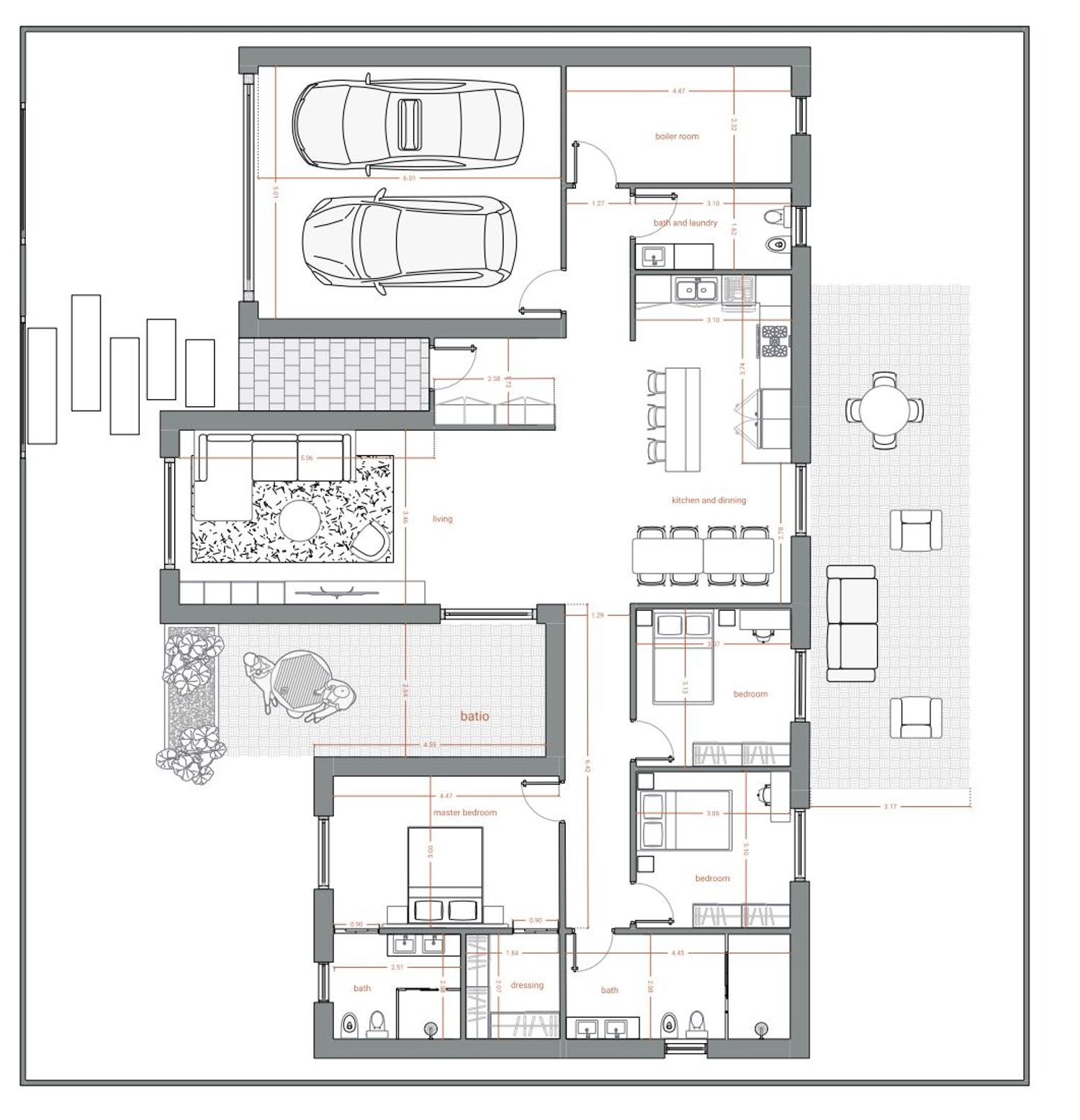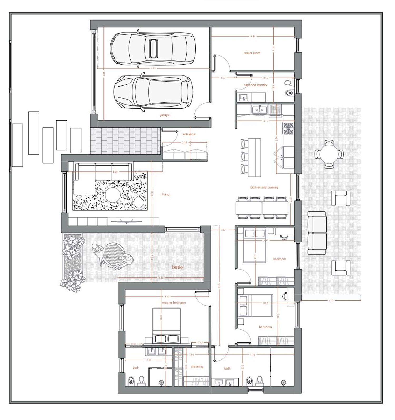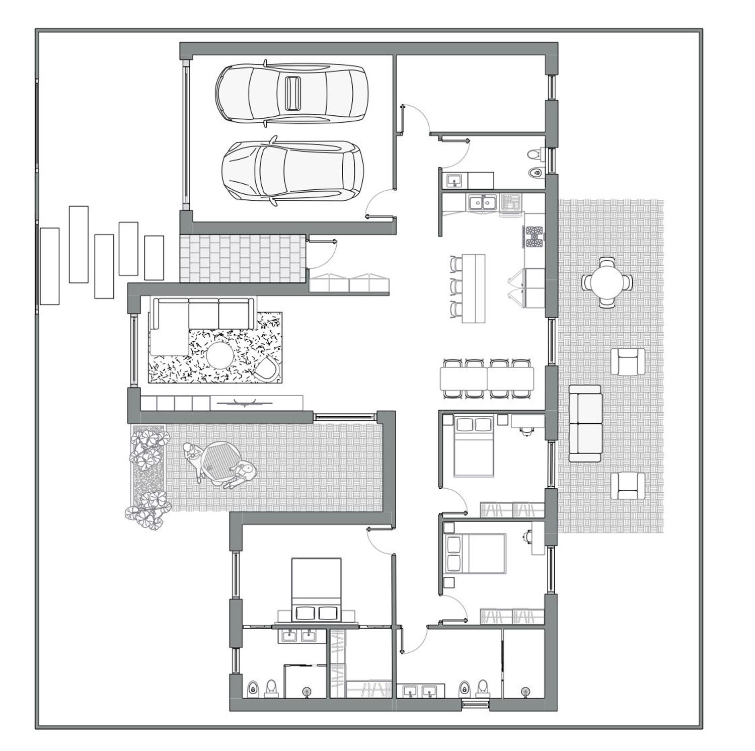 Infine, è stato progettato un patio posteriore collegato alla cucina, perfetto come spazio esterno di servizio e relax, migliorando la vivibilità complessiva della casa.