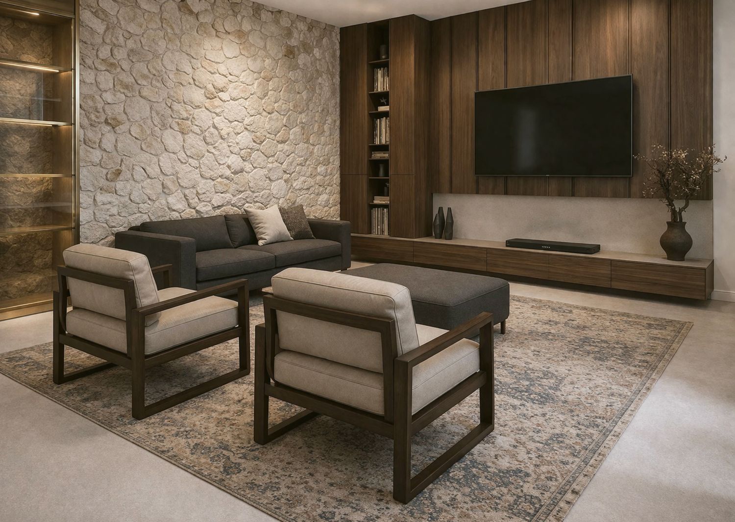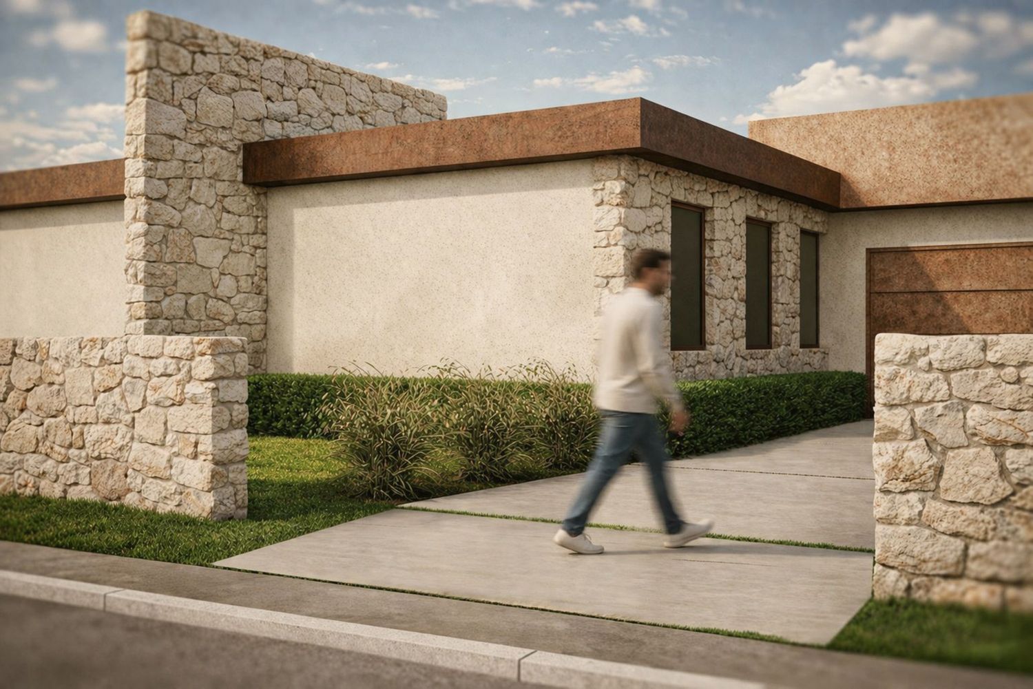 The project presents a refined example of contemporary single-story residential architecture, where material authenticity and volumetric clarity define the overall identity. The design is rooted in a balanced composition of solid and void, combining textured natural stone, smooth plastered surfaces, and warm-toned horizontal elements that frame the structure.