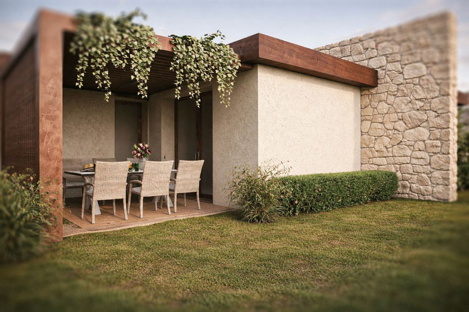 On the garden side, the project opens up to a sheltered outdoor dining area. Here, a pergola structure with vertical wooden slats introduces rhythm and transparency, allowing filtered light and partial visual permeability. In another variation, the pergola is softened with cascading greenery, enhancing the connection to nature and creating a more intimate, relaxed atmosphere.