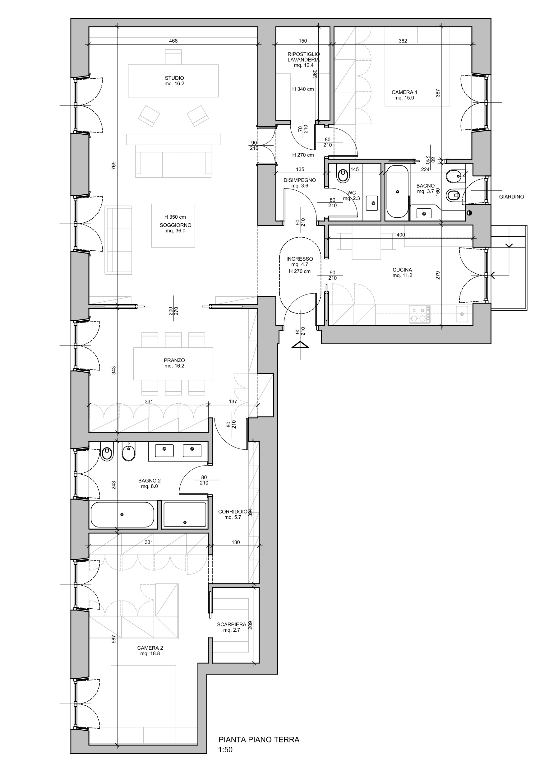 L'appartamento allo stato attuale si compone di: doppio ingresso, cucina dalla quale si accede al giardino privato (unico accesso), bagno 1, camera da letto 1 con piccola cabina armadio, salone doppio, sala da pranzo, bagno 2, camera da letto 2.