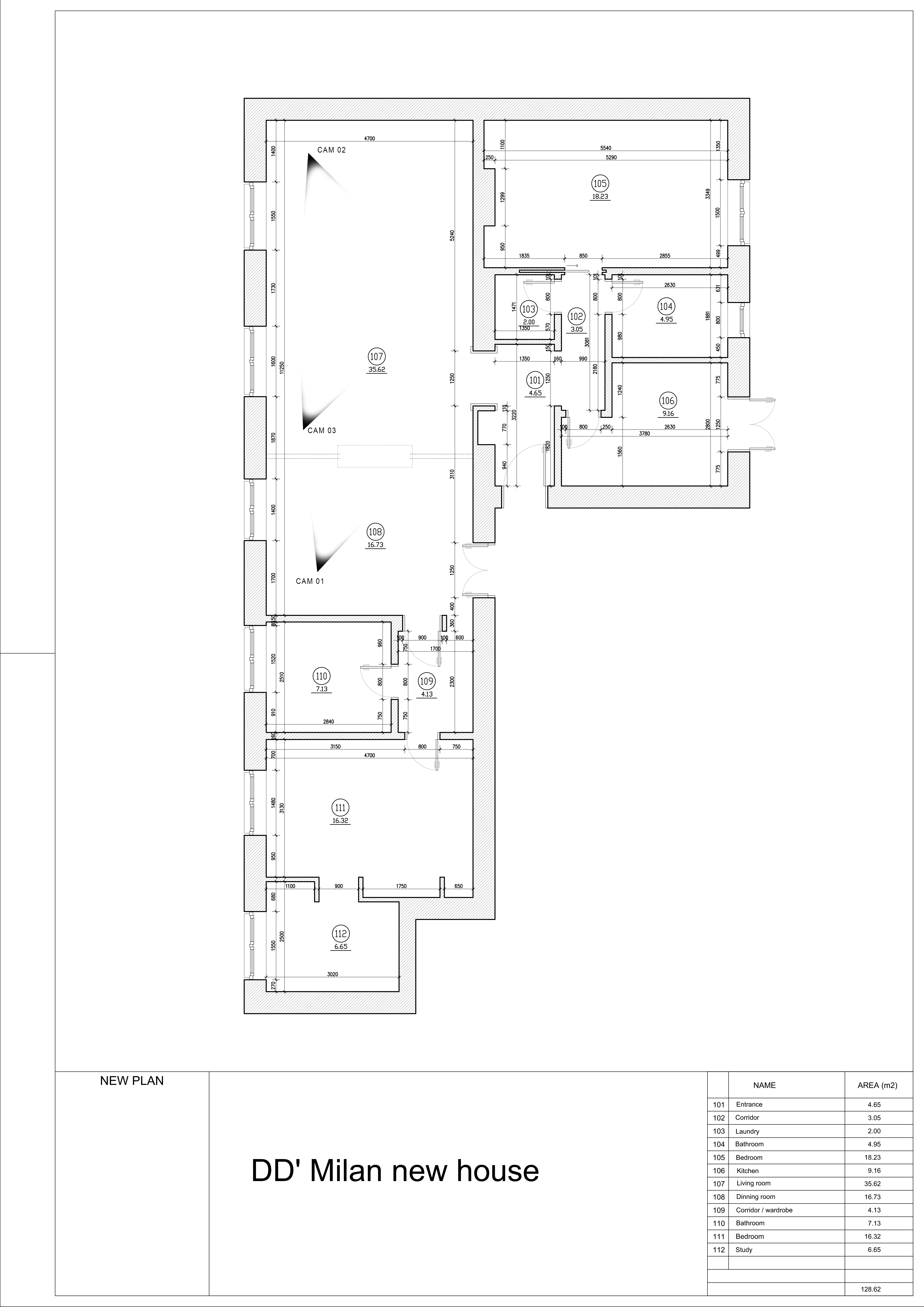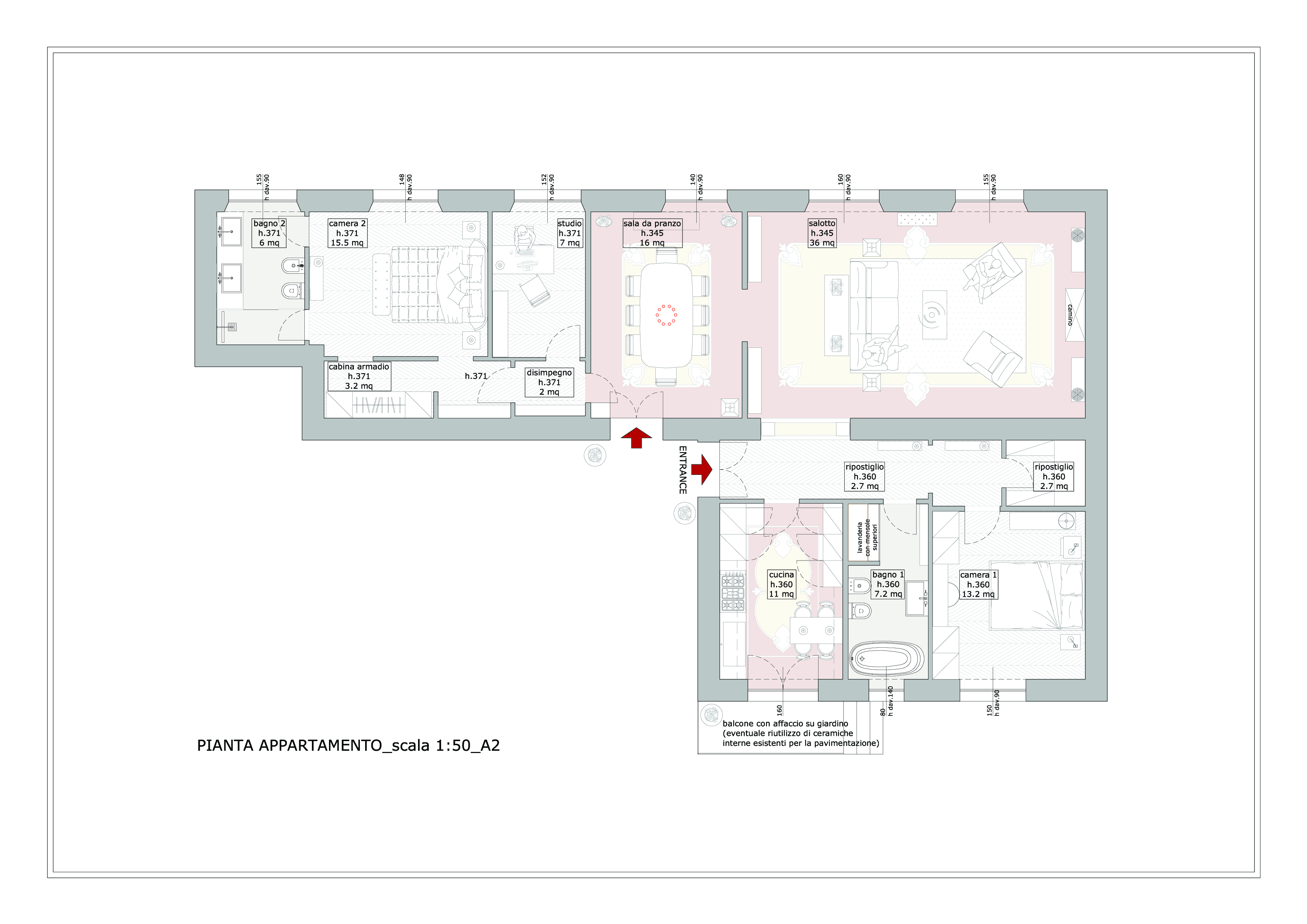 Aspetti negativi: presenza muri portanti (quello che divide il soggiorno dal corridoio e quello che divide la sala da pranzo da bagno 2), bagno 1 stretto, bagno 2 grande, camera da letto 2 grande.