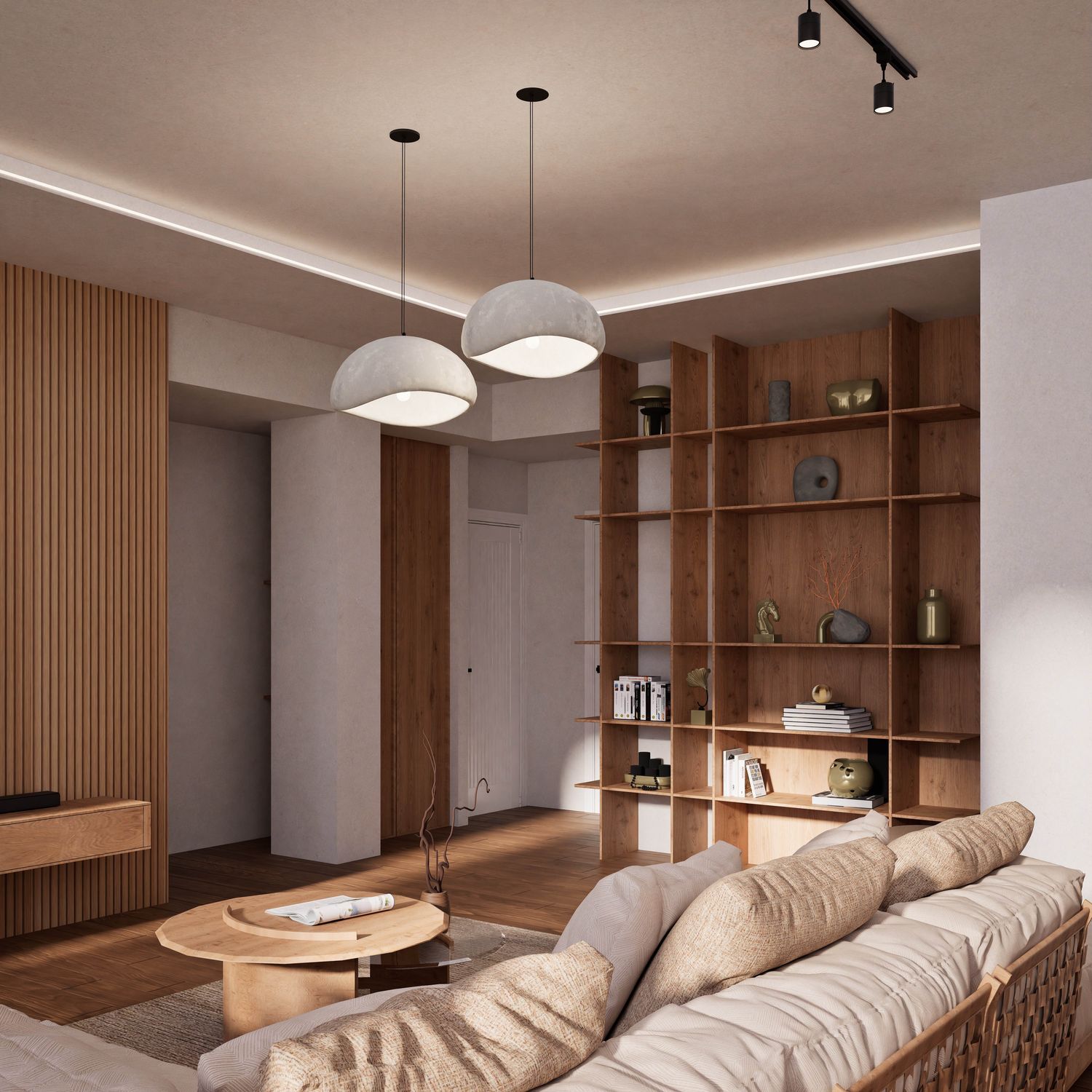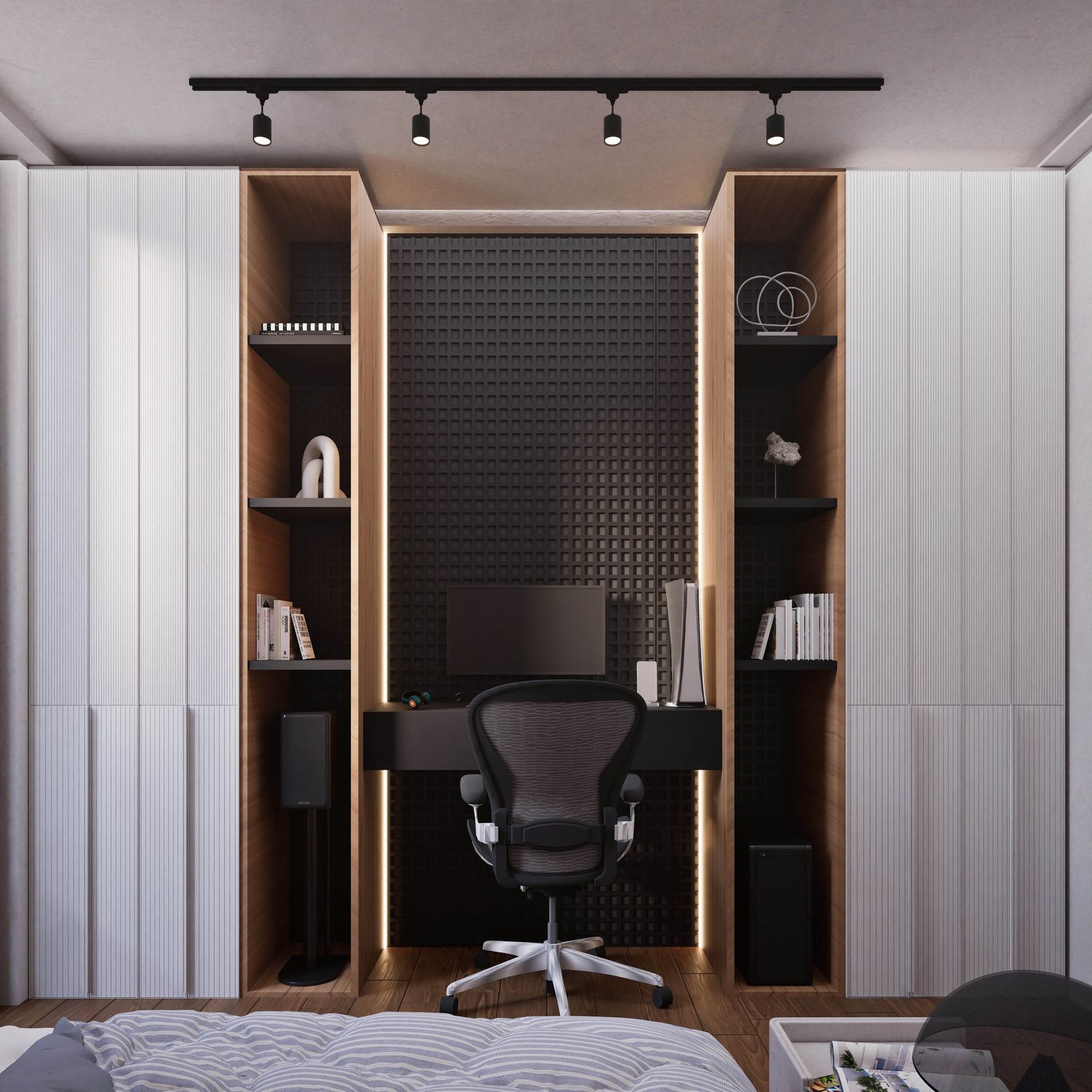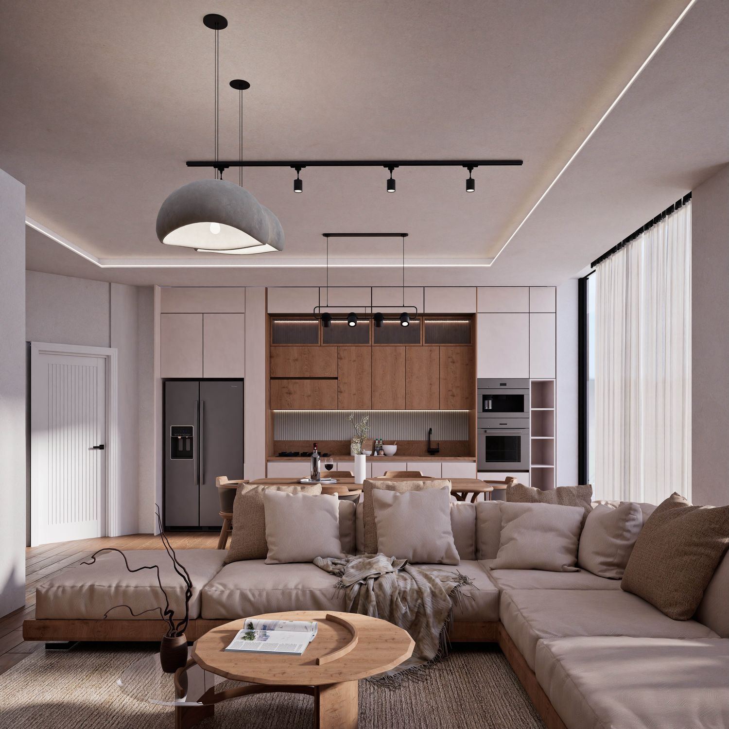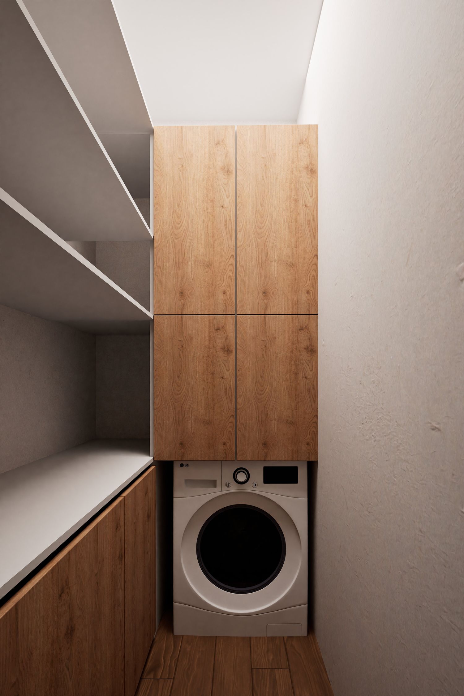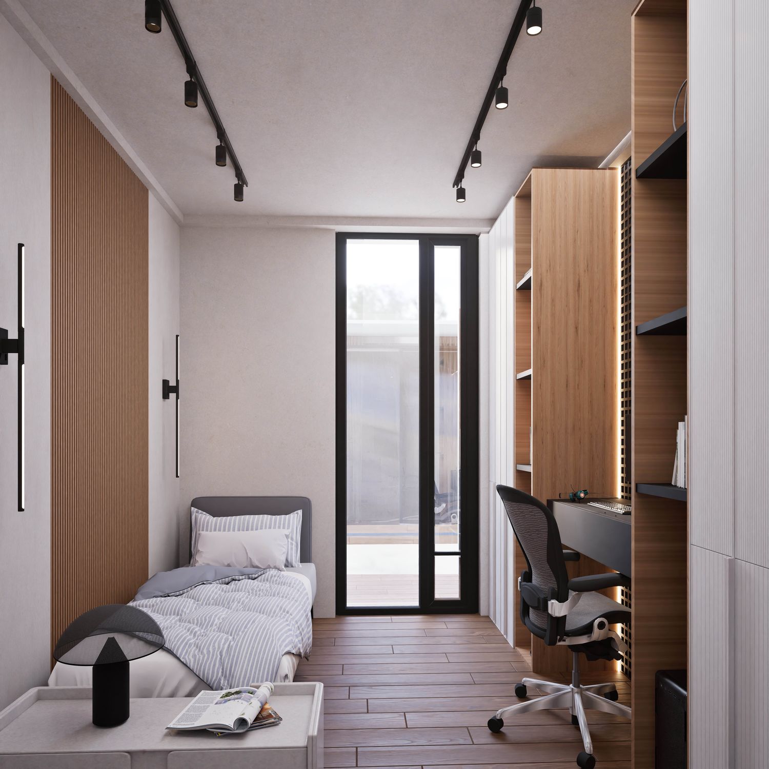 Additionally, the secondary entrance has been designed as a small, independent home office that still maintains direct access from within the apartment. Full-height doors and a hidden kitchen, beyond providing simplicity and visual harmony, elevate the spatial quality and aesthetics of the apartment, highlighting its modern and minimal identity.