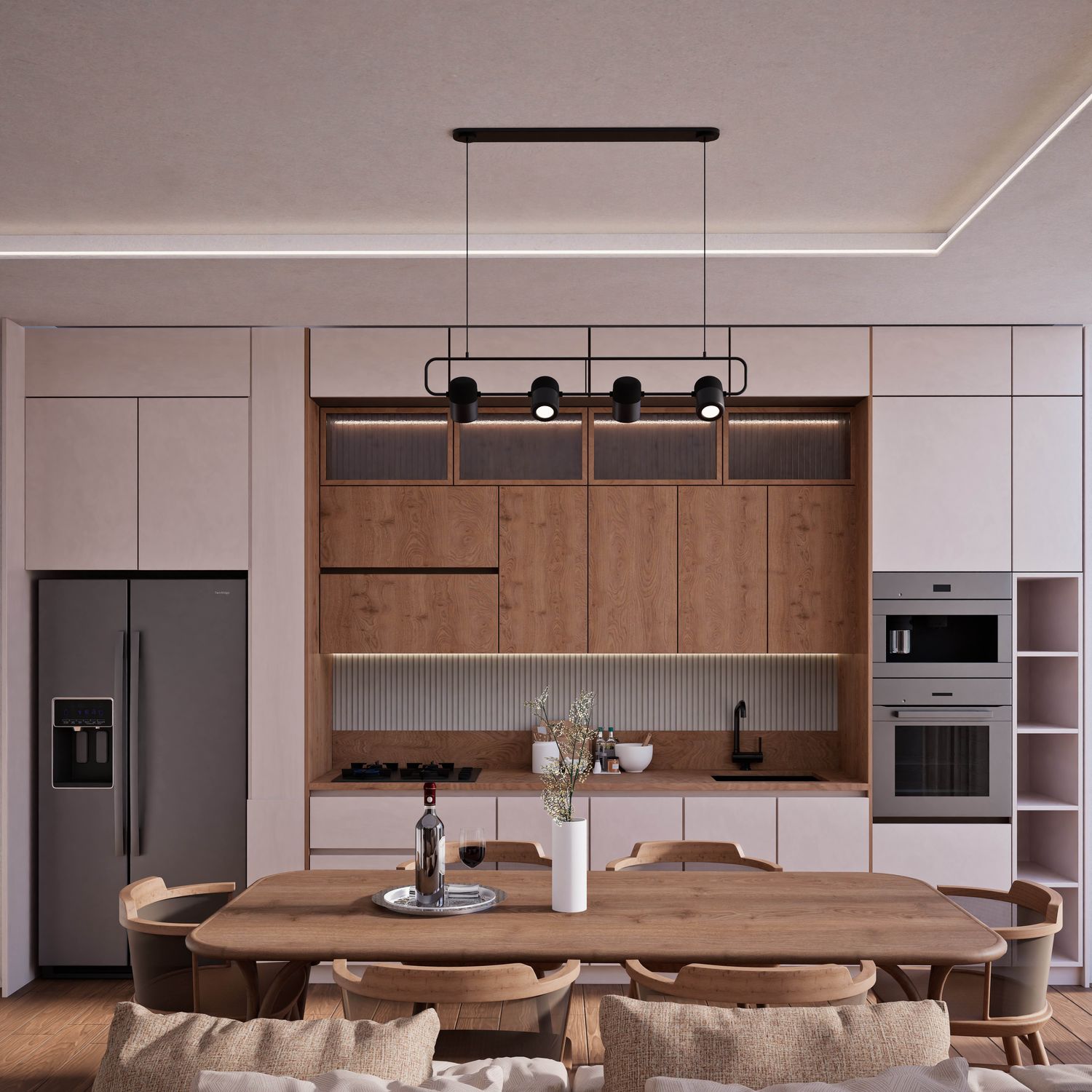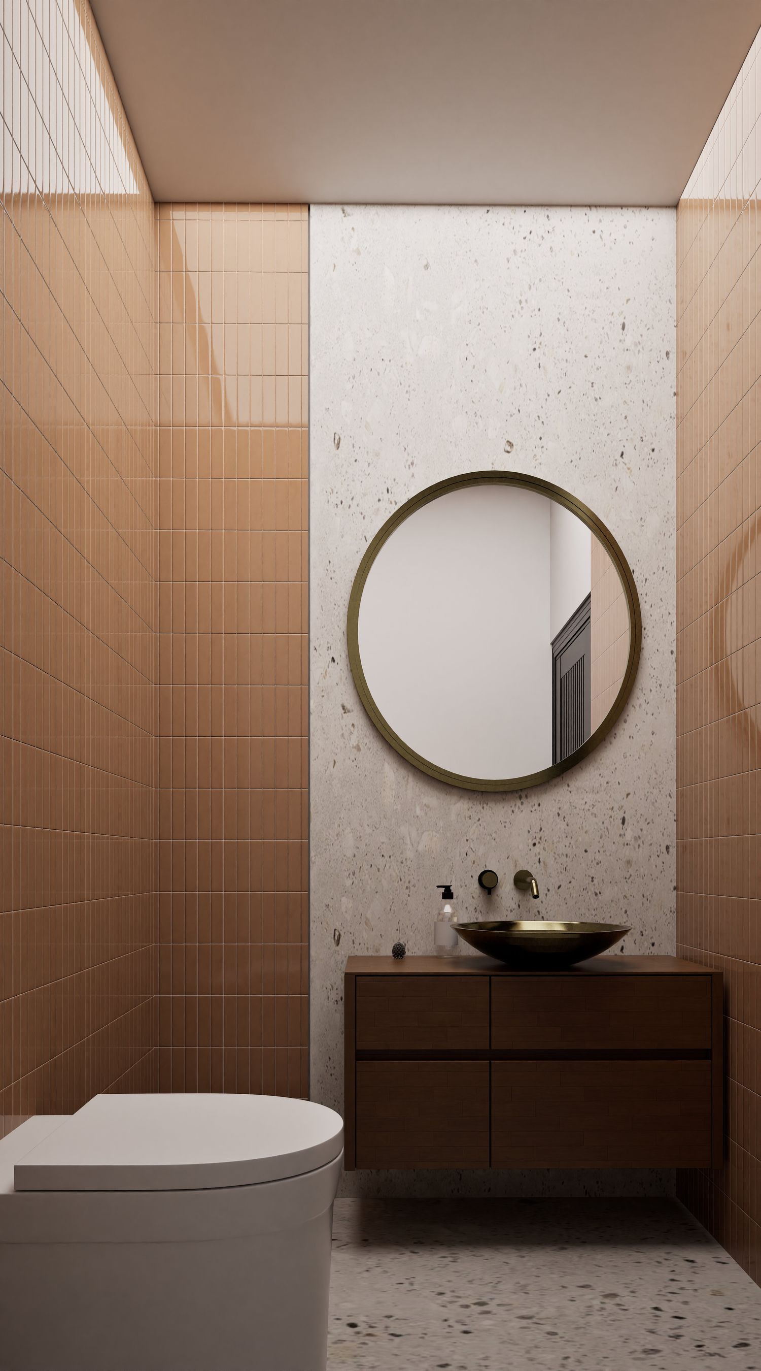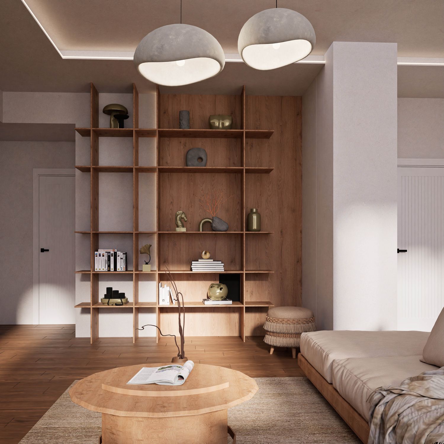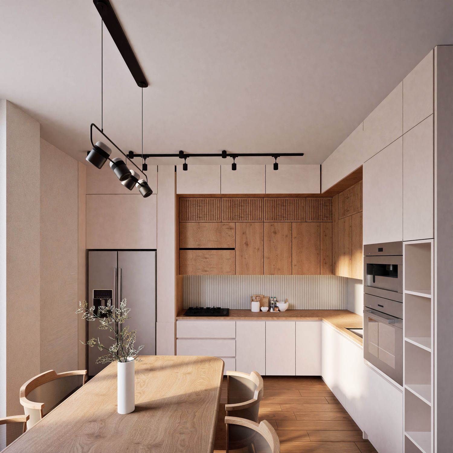 Additionally, the secondary entrance has been designed as a small, independent home office that still maintains direct access from within the apartment. Full-height doors and a hidden kitchen, beyond providing simplicity and visual harmony, elevate the spatial quality and aesthetics of the apartment, highlighting its modern and minimal identity.