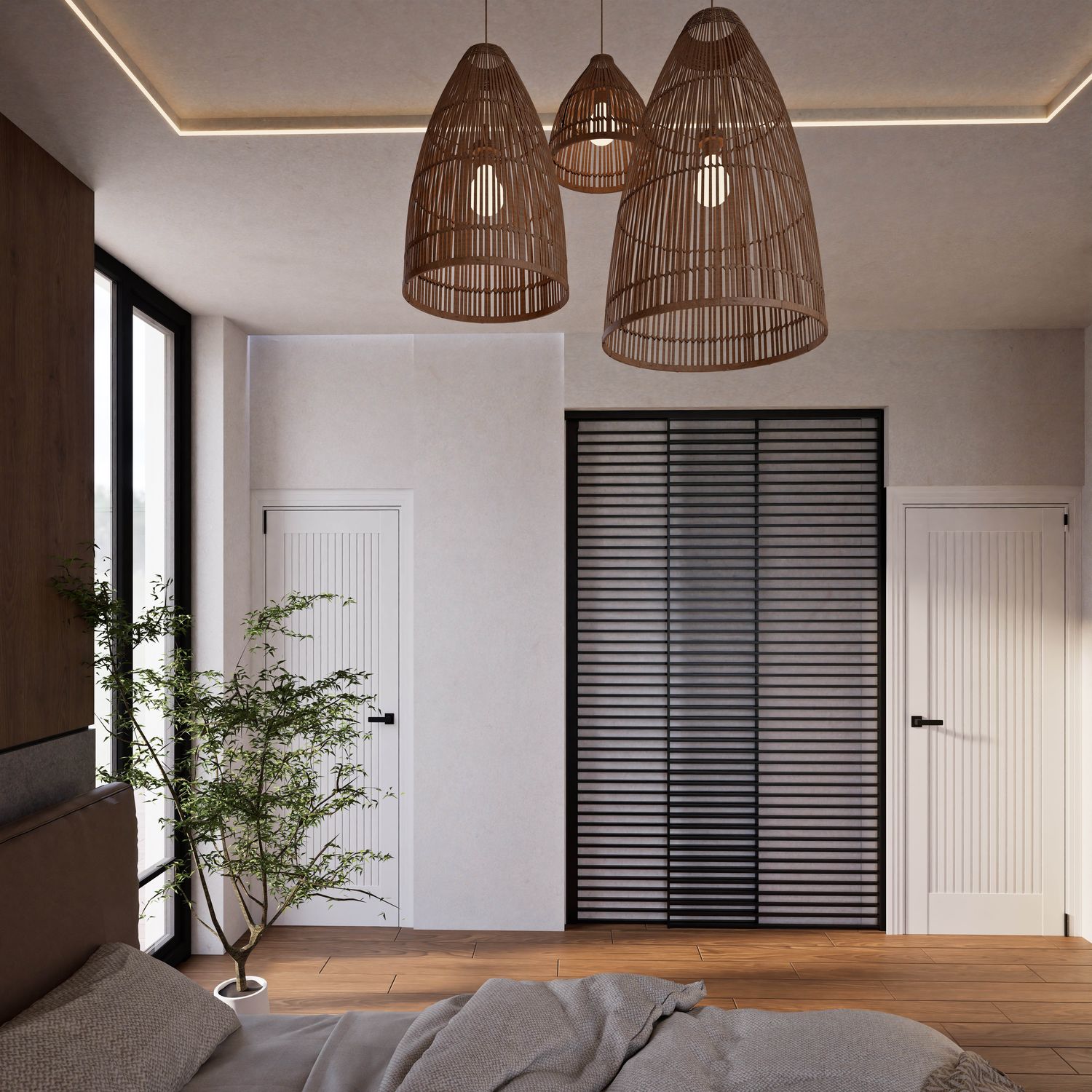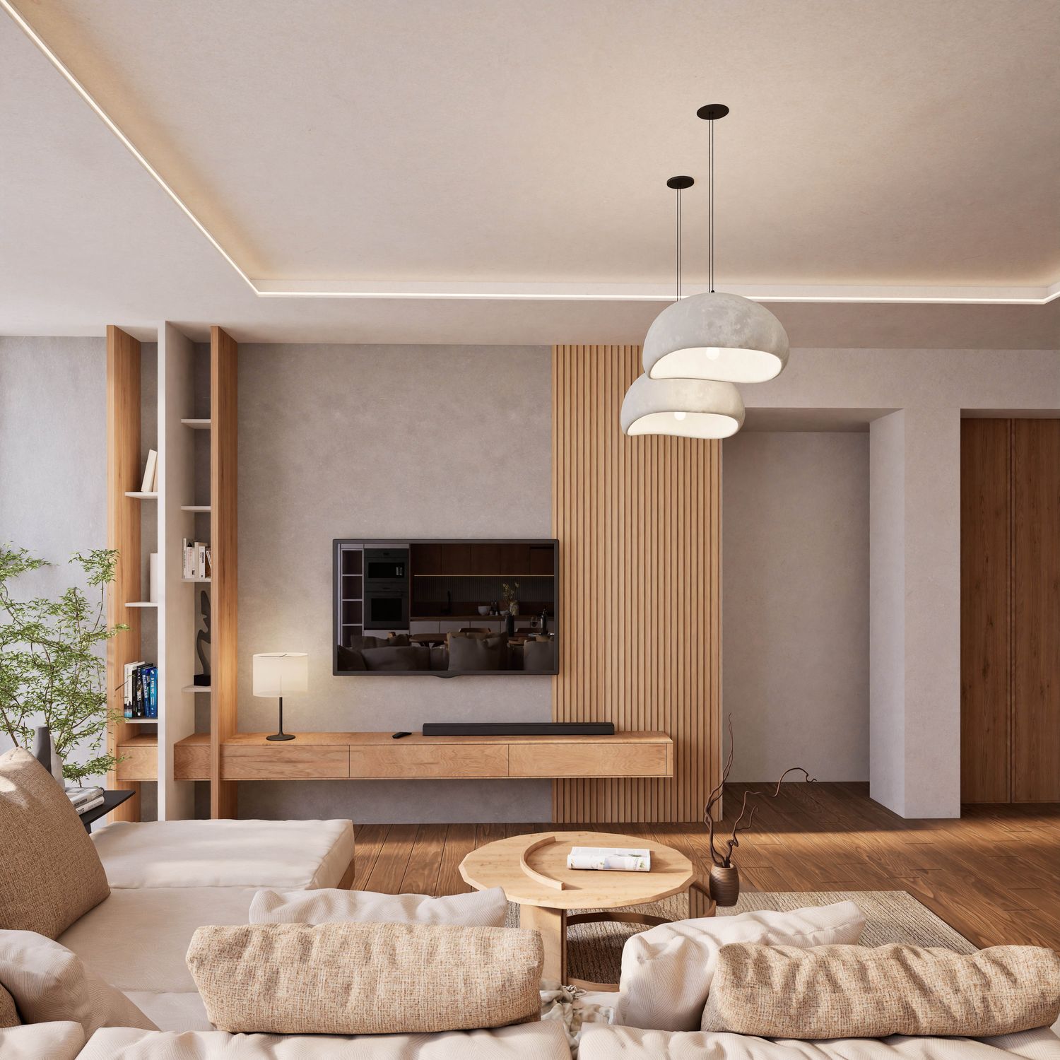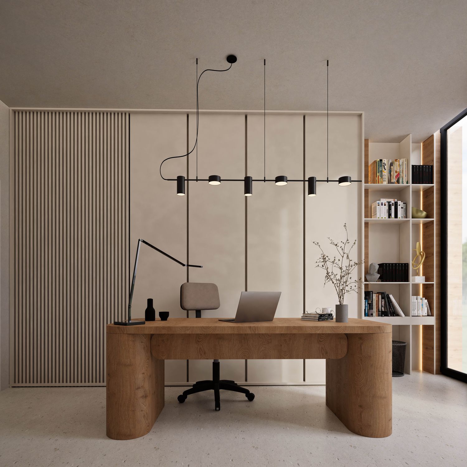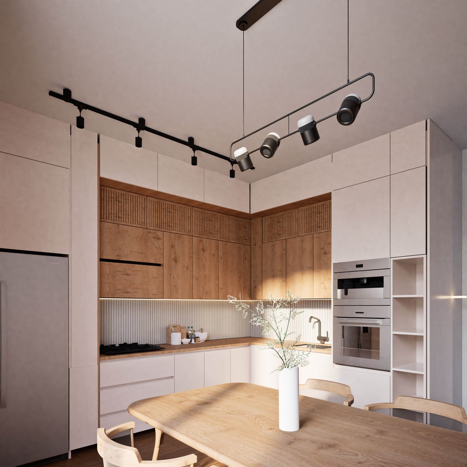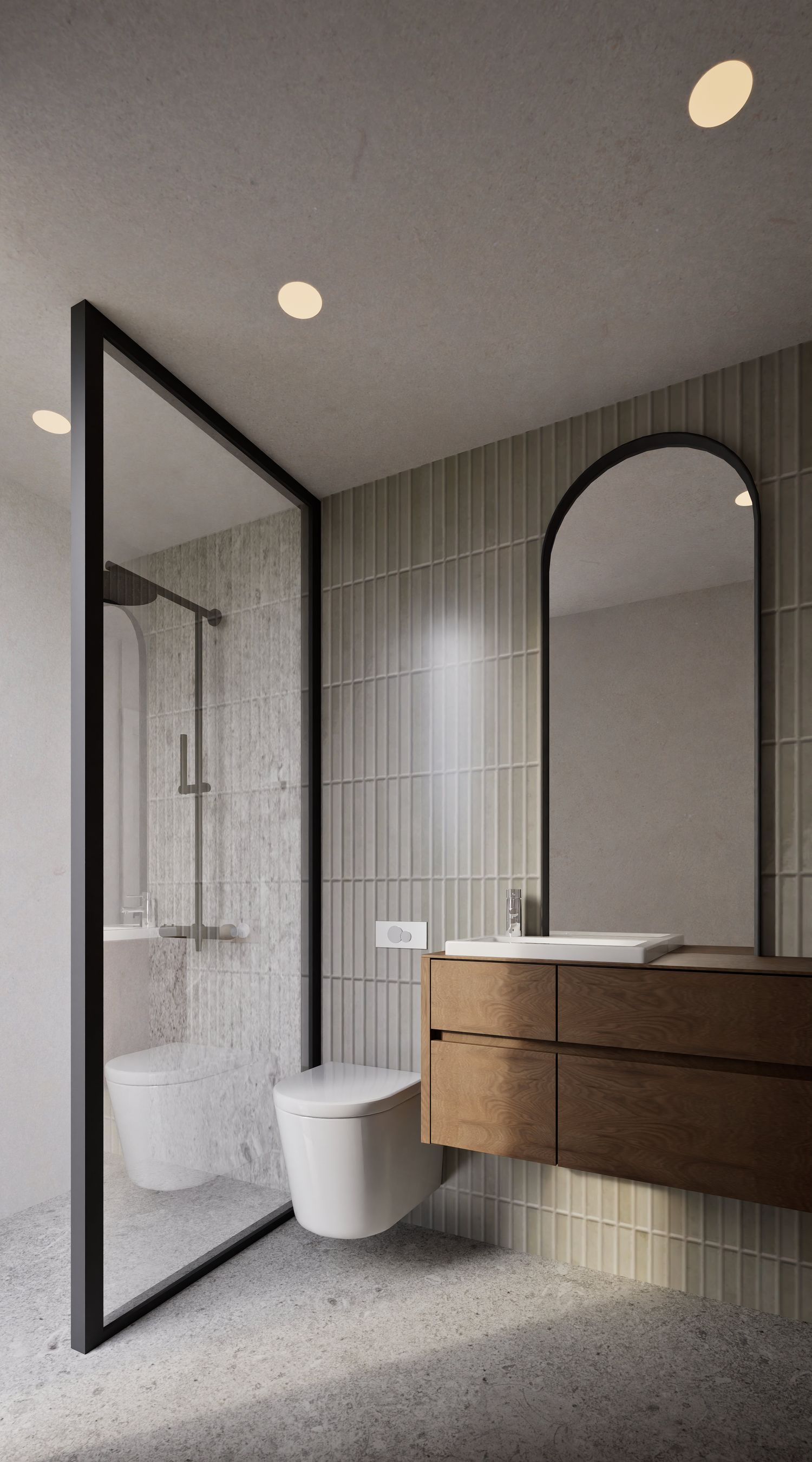 Additionally, the secondary entrance has been designed as a small, independent home office that still maintains direct access from within the apartment. Full-height doors and a hidden kitchen, beyond providing simplicity and visual harmony, elevate the spatial quality and aesthetics of the apartment, highlighting its modern and minimal identity.