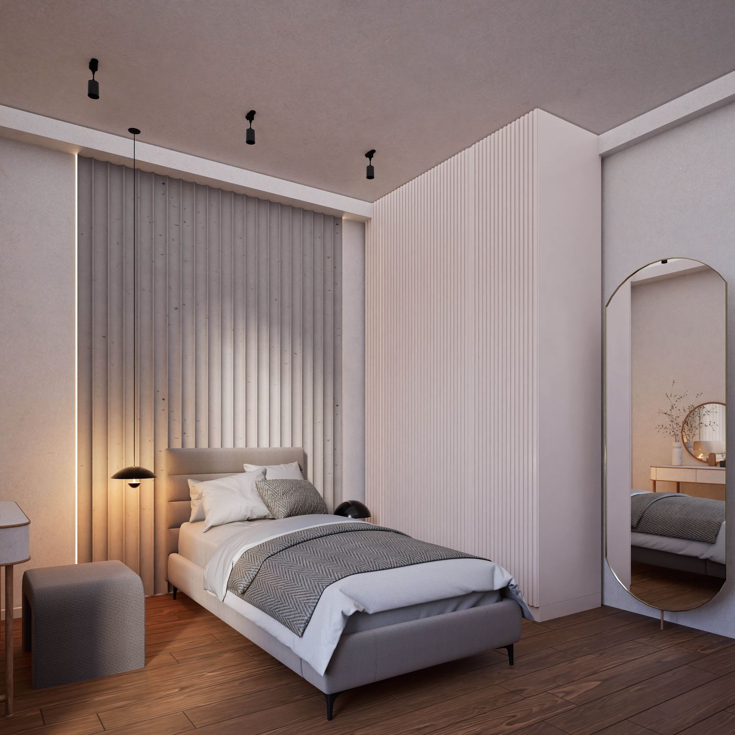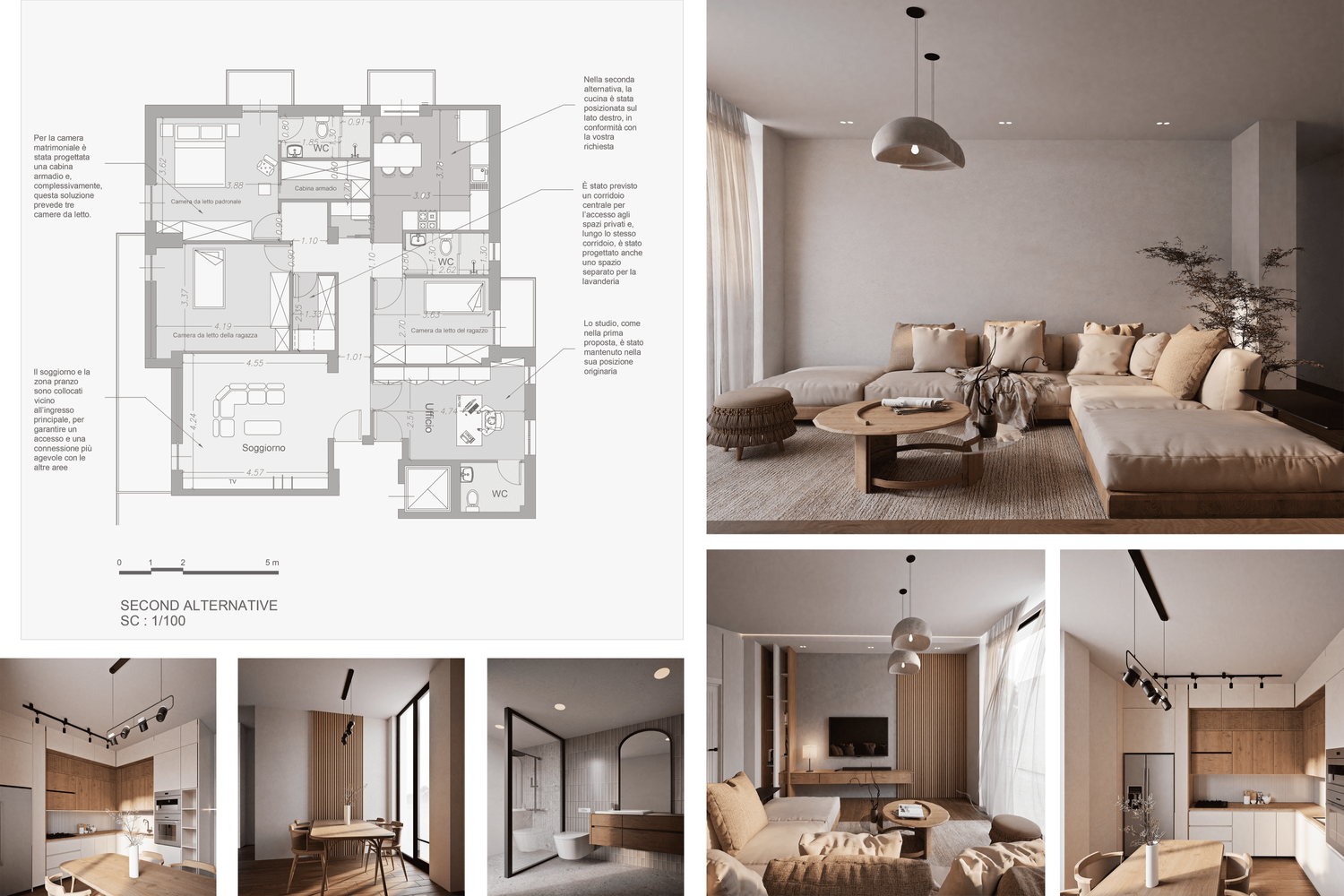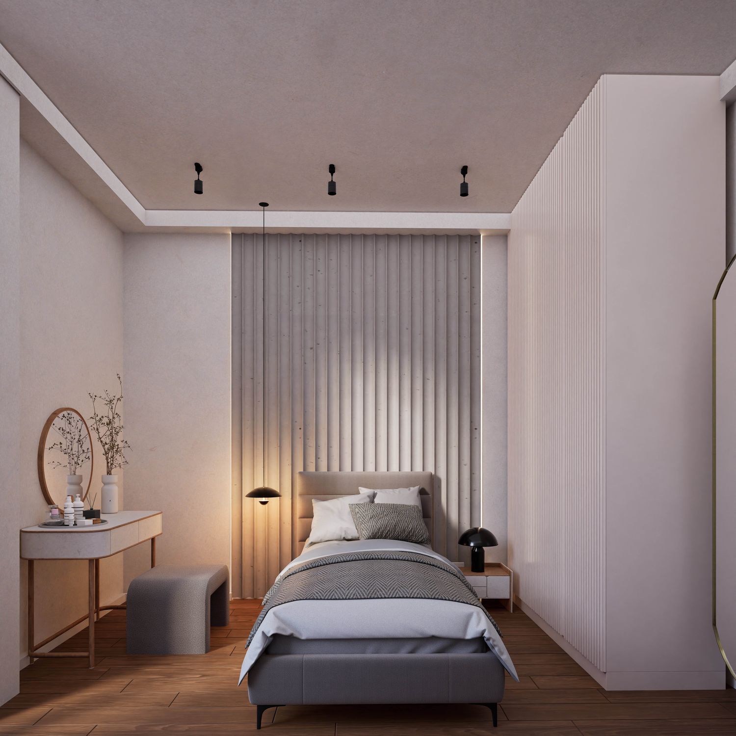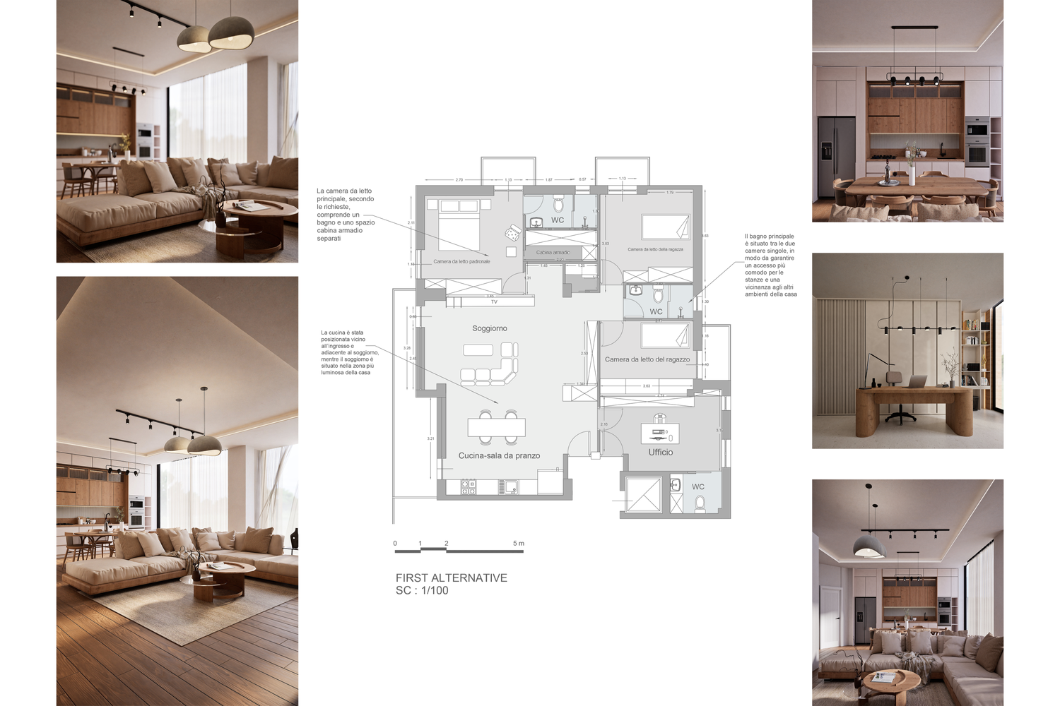 This design has been developed based on your needs and requirements for a four-person family apartment. The living and dining areas, together with the kitchen, are placed in the brightest part of the home to create an open, warm, and welcoming environment for family gatherings and entertaining guests. Three independent bedrooms with dedicated functions (a master suite with a private bathroom and walk-in closet, a boy’s room with a gaming station, and a girl’s room with a study desk and dressing table) ensure comfort and privacy for all family members.
