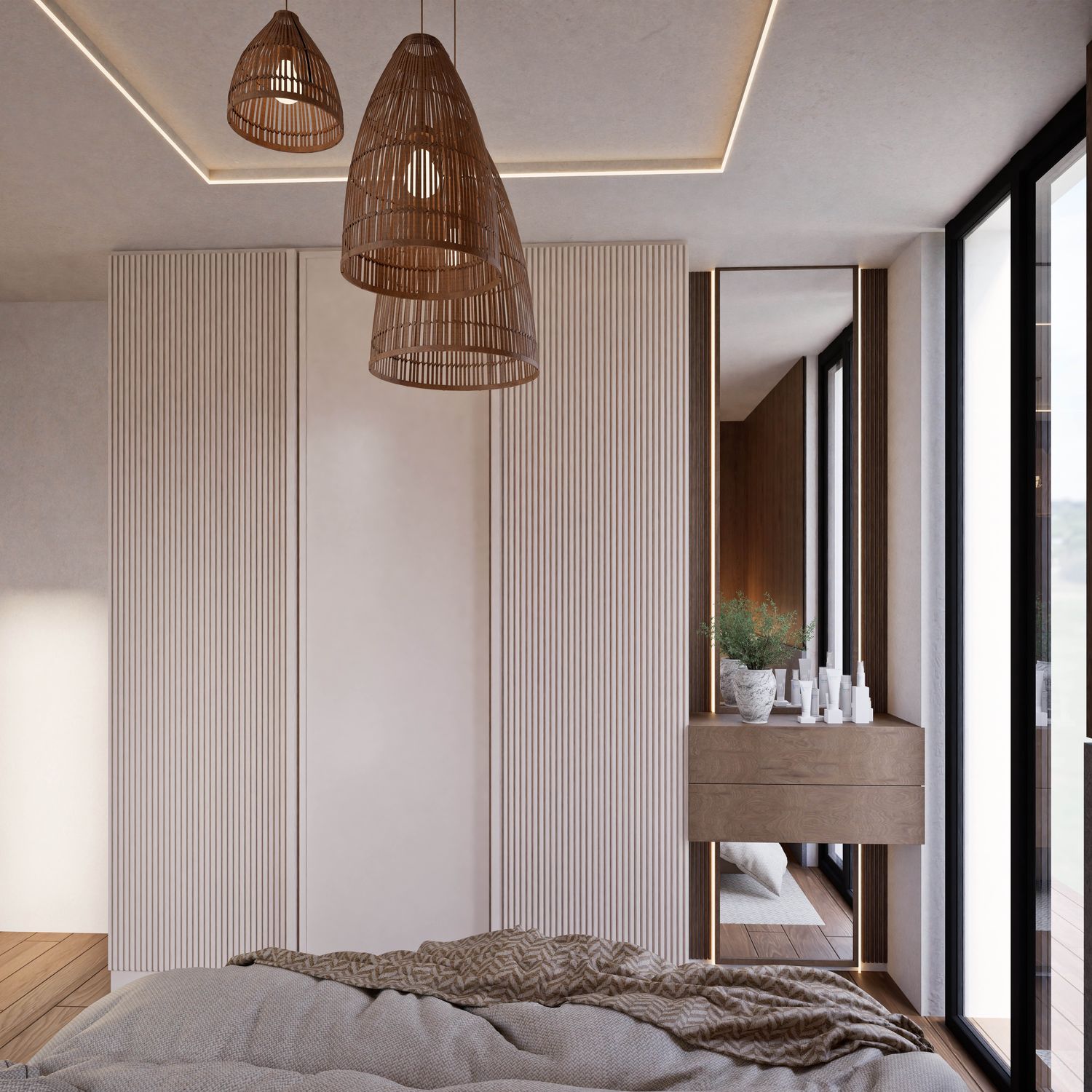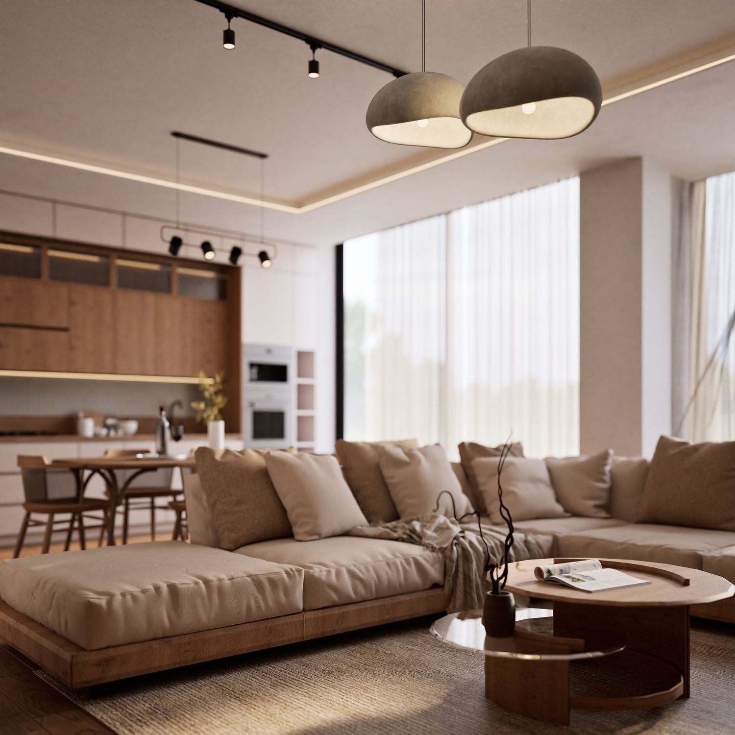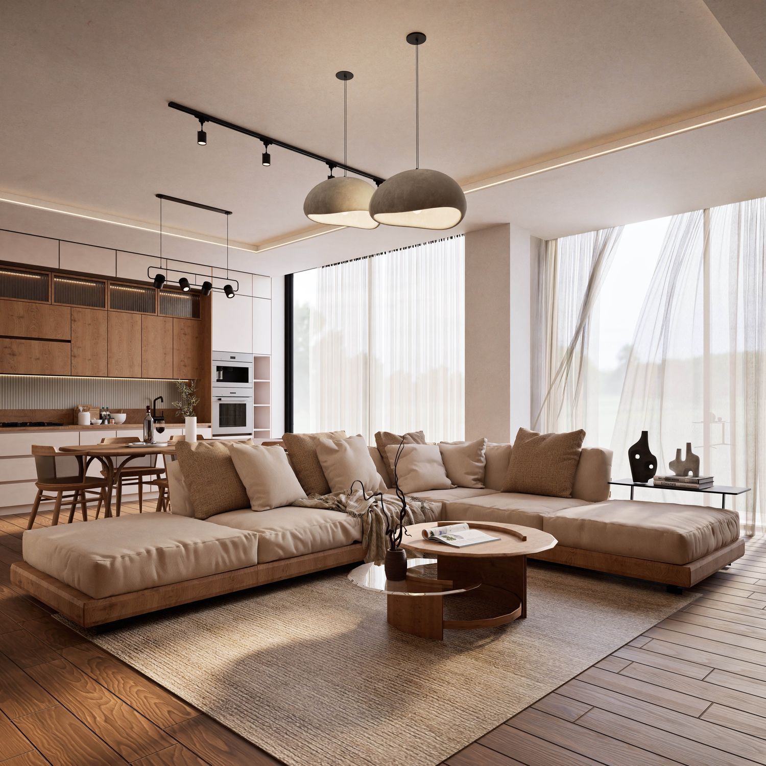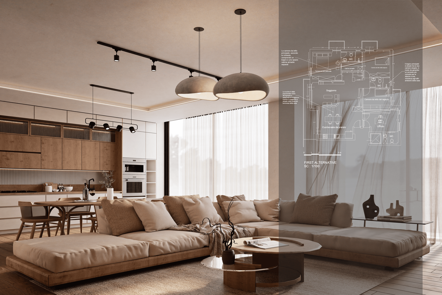 This design has been developed based on your needs and requirements for a four-person family apartment. The living and dining areas, together with the kitchen, are placed in the brightest part of the home to create an open, warm, and welcoming environment for family gatherings and entertaining guests. Three independent bedrooms with dedicated functions (a master suite with a private bathroom and walk-in closet, a boy’s room with a gaming station, and a girl’s room with a study desk and dressing table) ensure comfort and privacy for all family members.