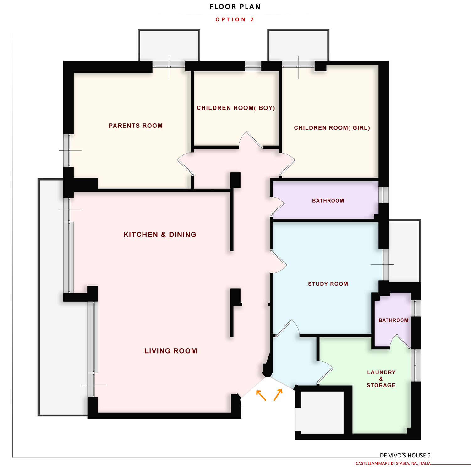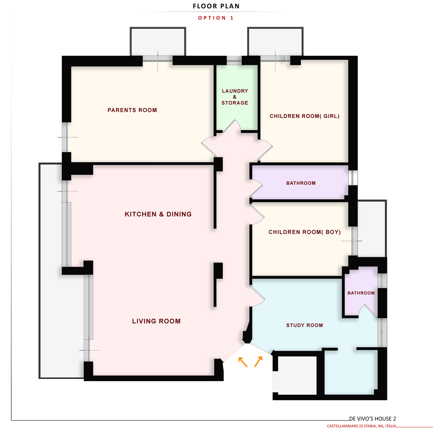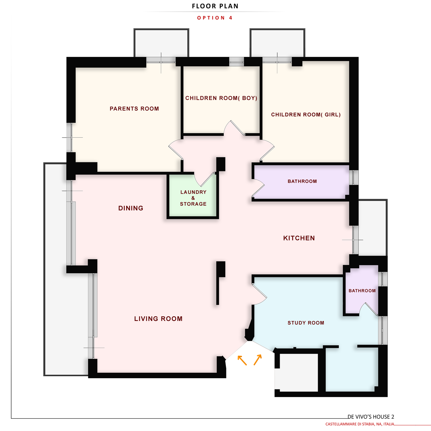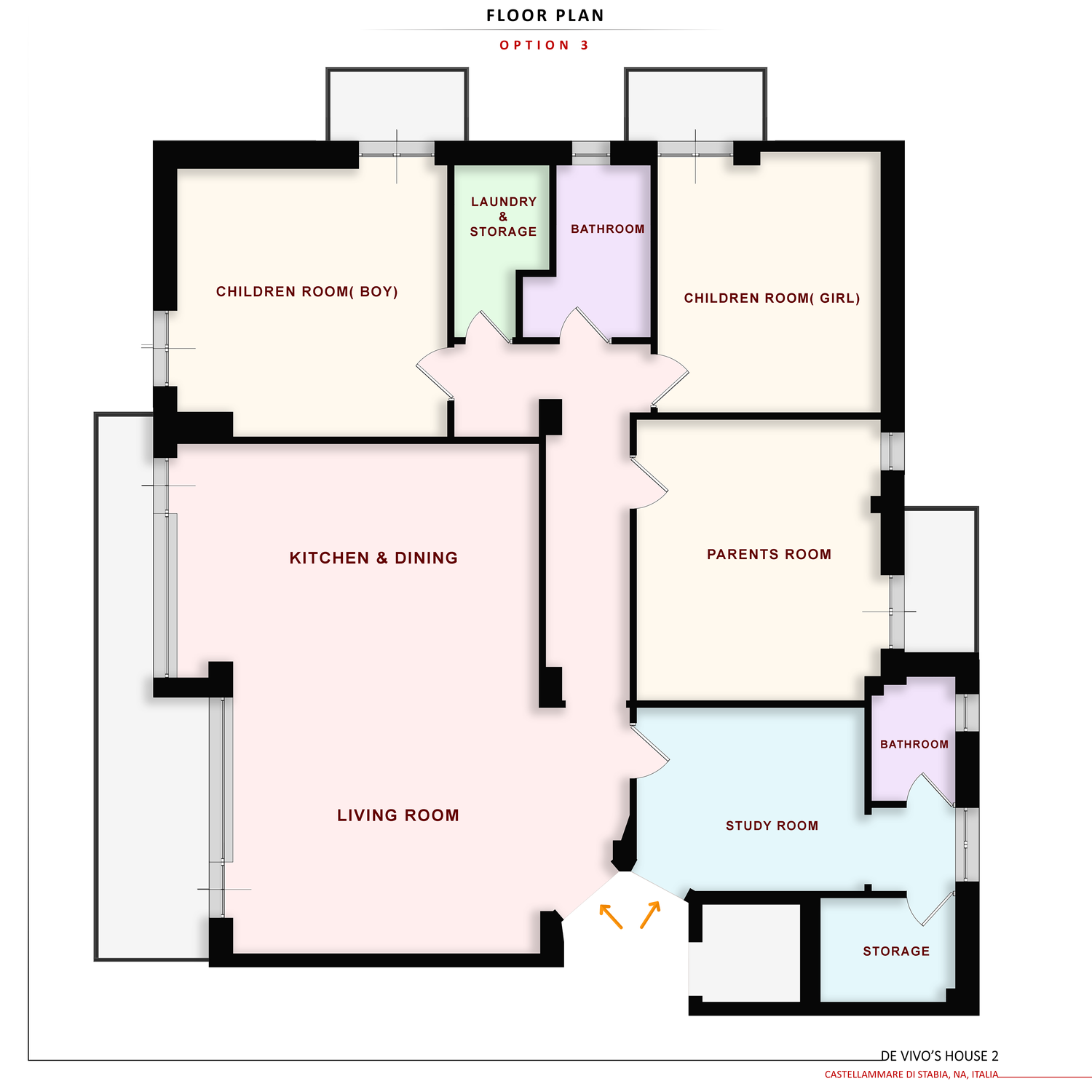 In questo progetto, la cucina è collocata sul lato destro della pianta e separata dal soggiorno. È prevista un’area pranzo separata, mentre il bagno rimane nella posizione originale. La lavanderia è posizionata centralmente, accanto alle camere, per un facile accesso. La disposizione delle camere segue quella dell’Opzione 2, mentre l’area studio è simile a quella dell’Opzione 1.