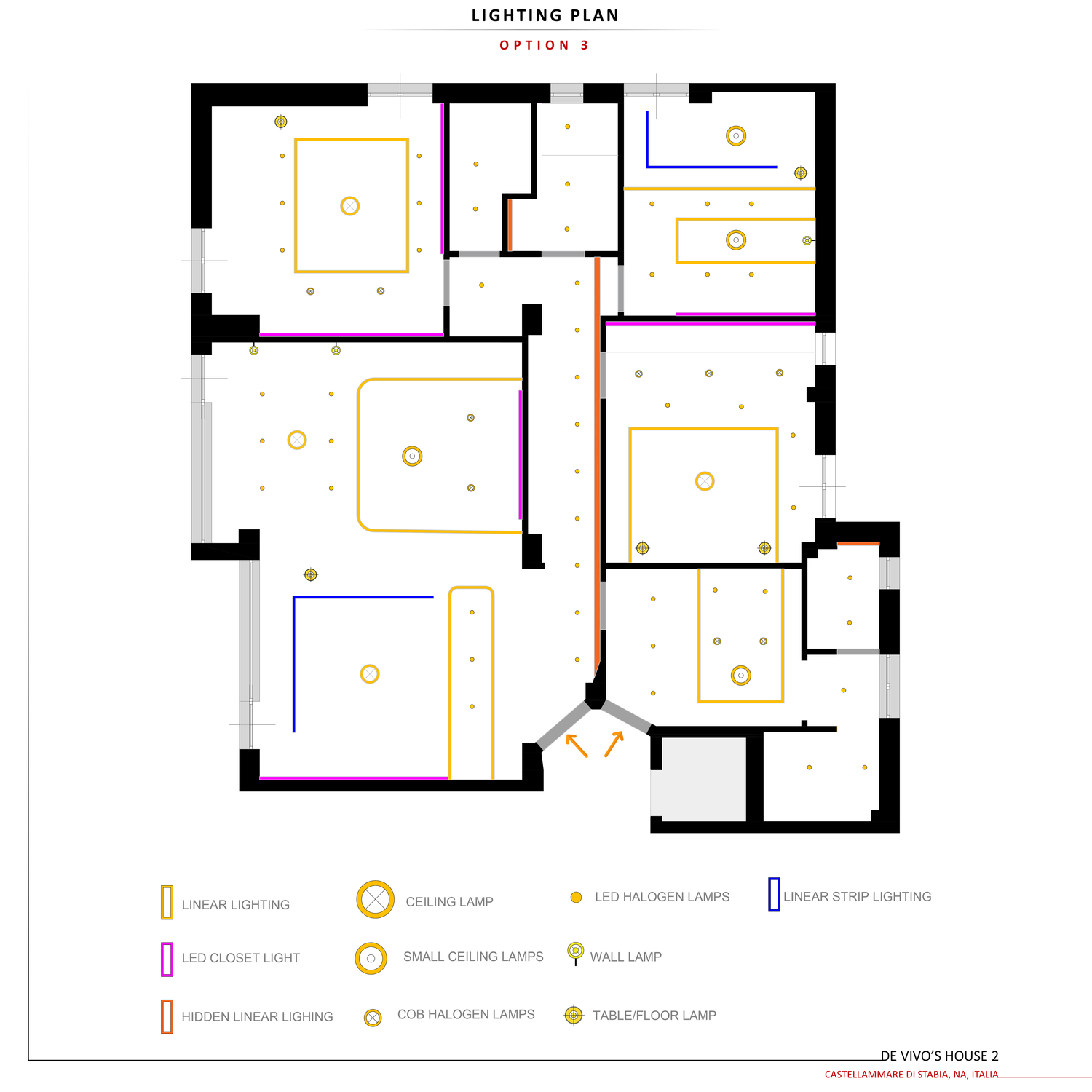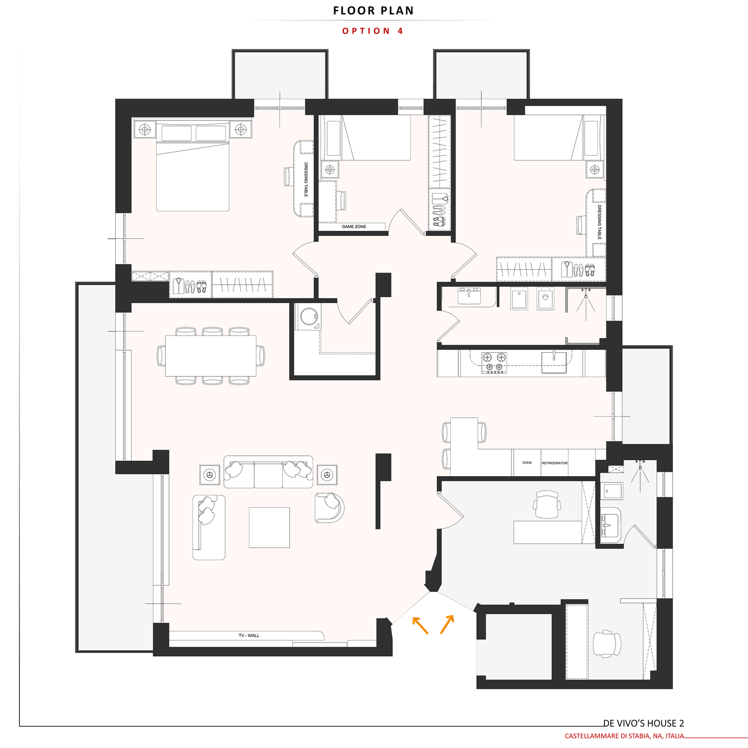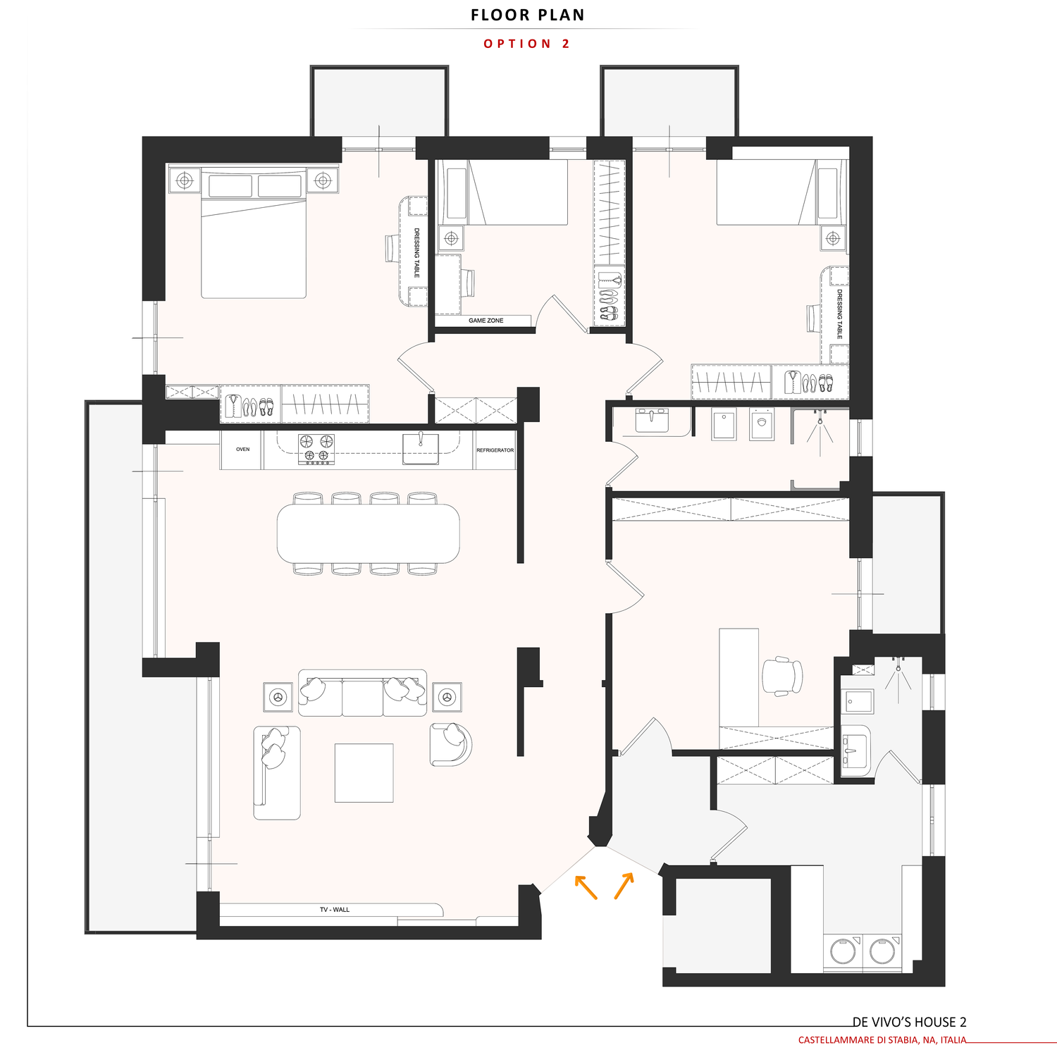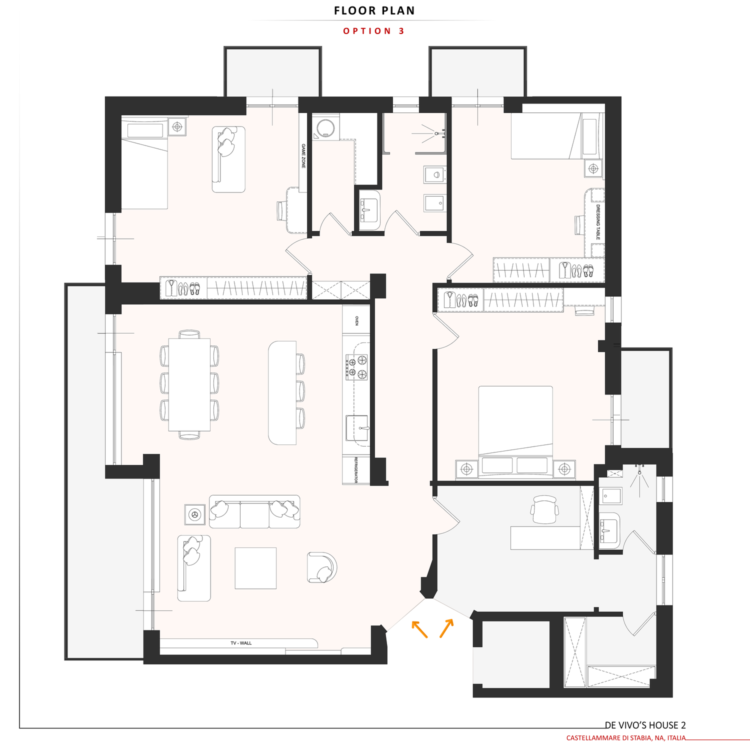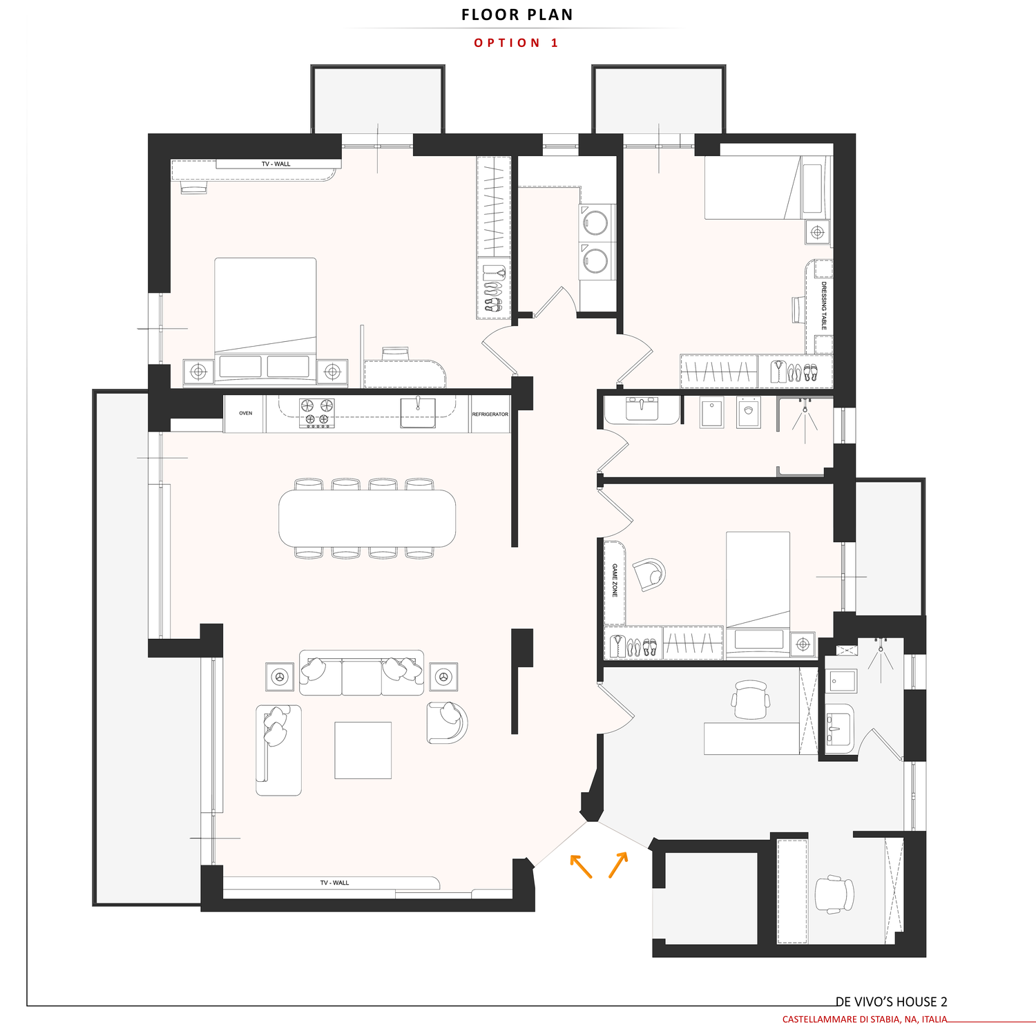 Il bagno è mantenuto nella posizione attuale, con lavanderia e ripostiglio collocati tra le camere. La camera matrimoniale è stata ampliata e tutte le camere sono dotate di armadi spaziosi e di una scrivania o di un tavolo da toeletta. La camera del ragazzo dispone di un’area gaming dedicata e tutte le camere hanno accesso al balcone.