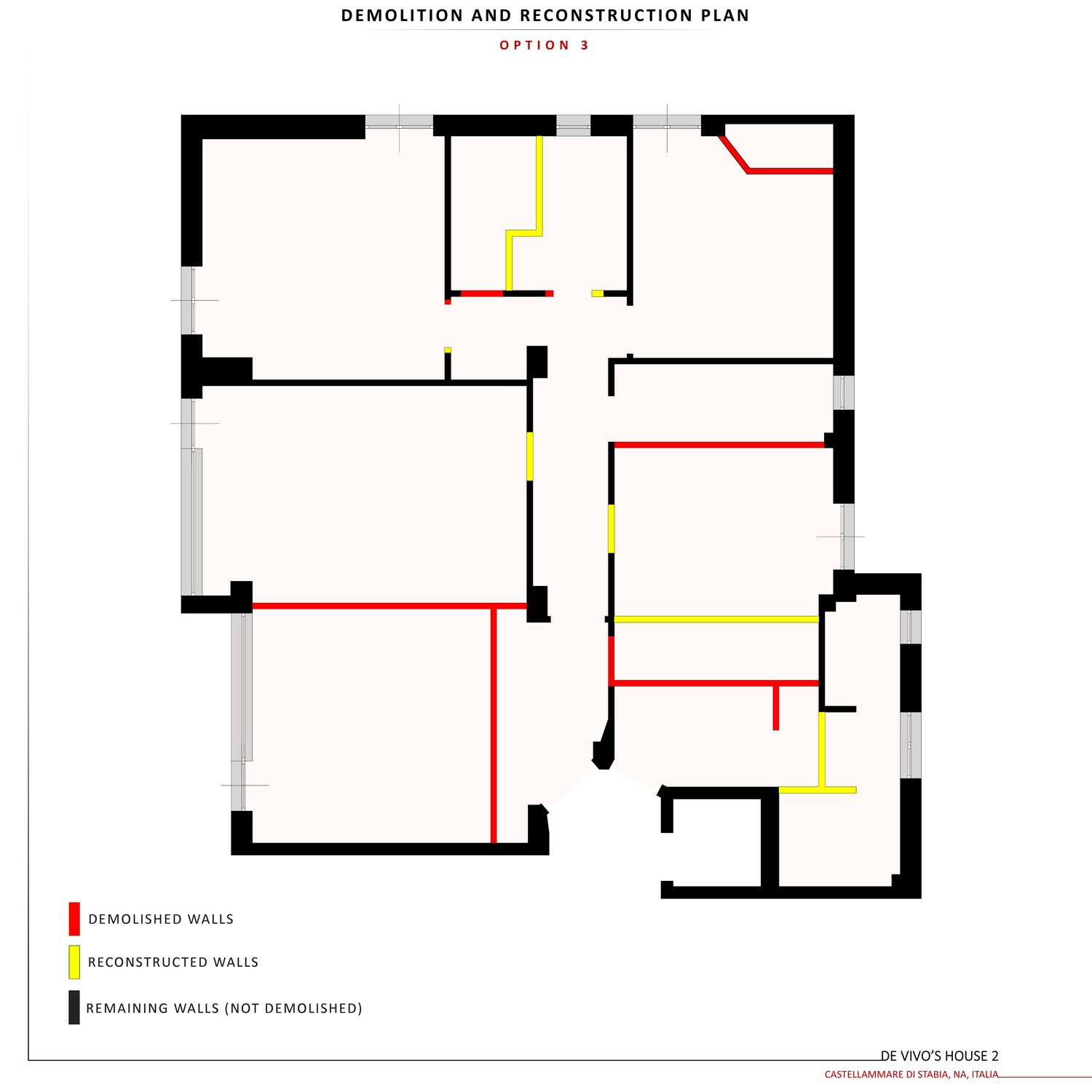Questa soluzione richiede il minor numero di demolizioni e modifiche. L’impianto generale degli spazi è conservato, concentrandosi sull’ampliamento della zona giorno e della cucina. Le camere da letto rimangono nelle posizioni originali ma sono state riprogettate secondo standard moderni. La lavanderia e il ripostiglio sono stati trasferiti nell’unità più piccola e posizionati separatamente rispetto all’area studio. La disposizione di soggiorno e cucina è simile a quella dell’Opzione 1.