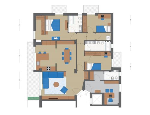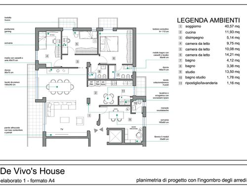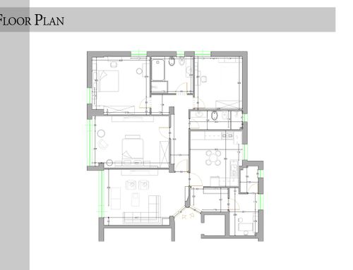 QuisiĂ©ramos un departamento moderno para una familia de 4 personas con tres habitaciones, una para la pareja y dos para los dos hijos (un niño y una niña). TambiĂ©n se desea una amplia zona de estar y una cocina. La casa tiene dos entradas independientes, por lo que una podrĂa destinarse a un estudio con un baño adjunto.