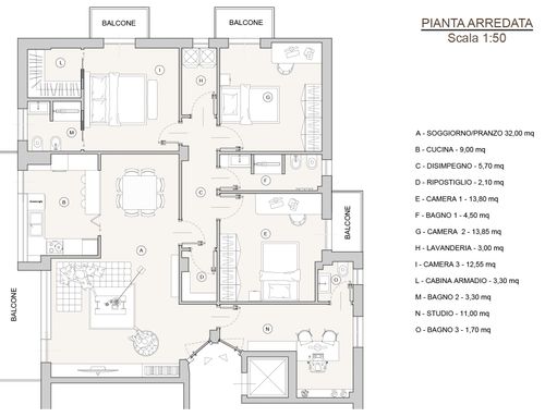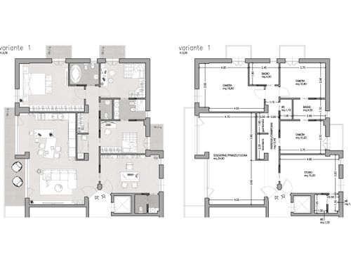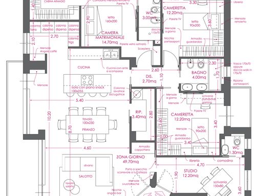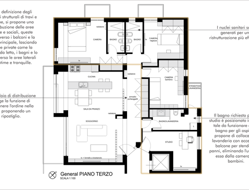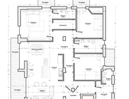 Vorremmo un appartamento moderno per una famiglia di 4 persone con tre camere da letto di cui una per 2 coniugi e due per 2 figli (maschio e femmina). Ampia zona a giorno e una cucina. La casa ha due ingressi indipendenti per cui uno potrebbe essere destinato ad uno studio con annesso bagno.