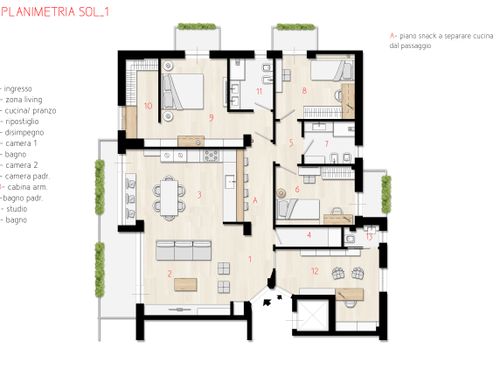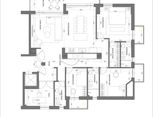 We would like a modern apartment for a family of 4 with three bedrooms, one for a couple and two for the two children (a boy and a girl). A spacious living area and a kitchen are also desired. The house has two independent entrances, so one could be designated for a study with an attached bathroom.
