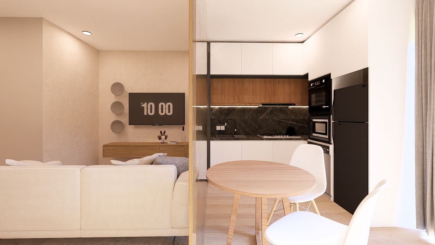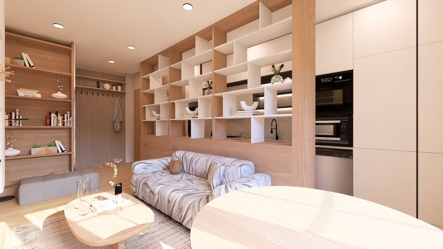 Questa soluzione privilegia una chiara distinzione tra zona soggiorno e cucina, ottenuta tramite elementi d’arredo e partizioni leggere.