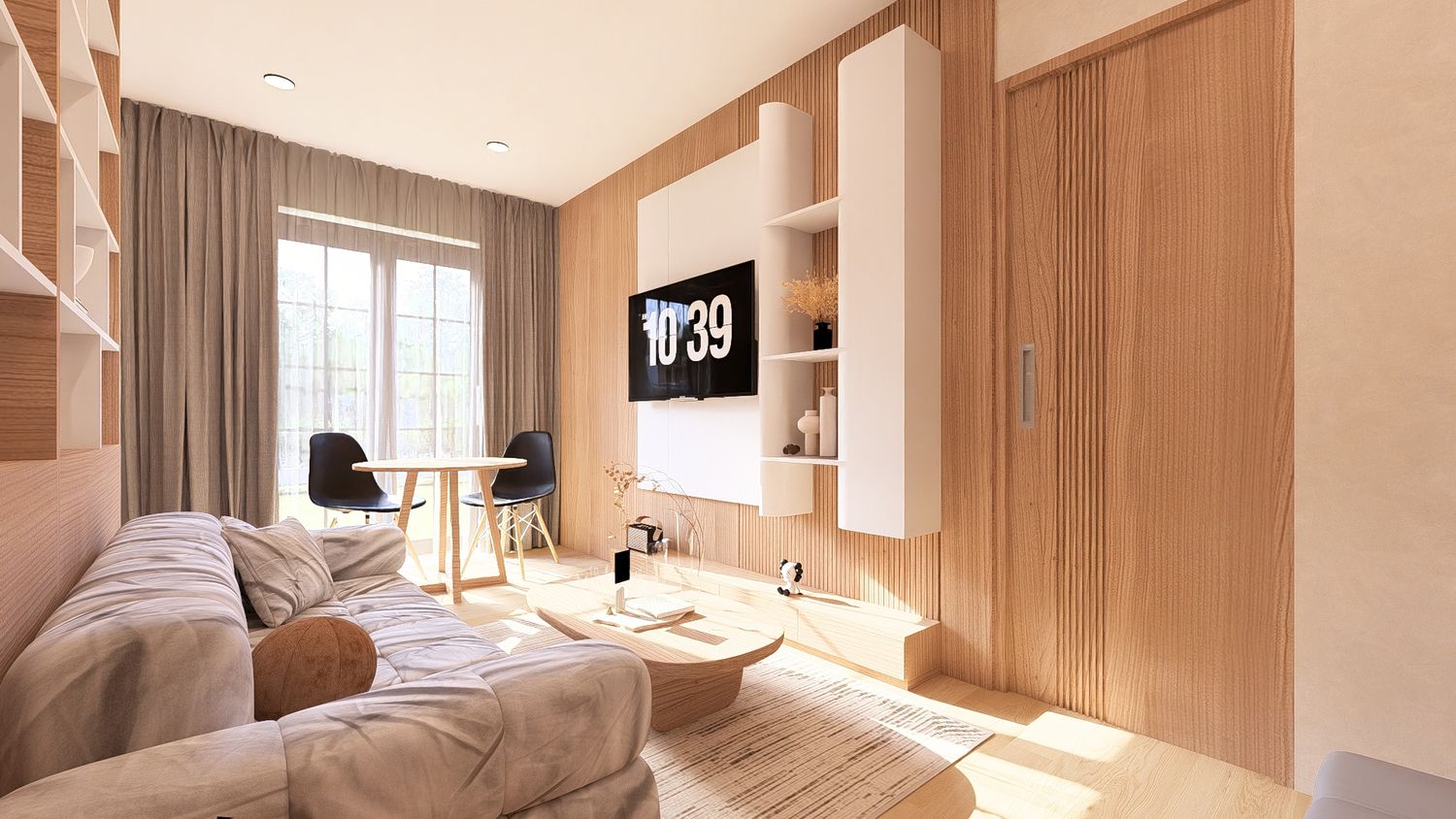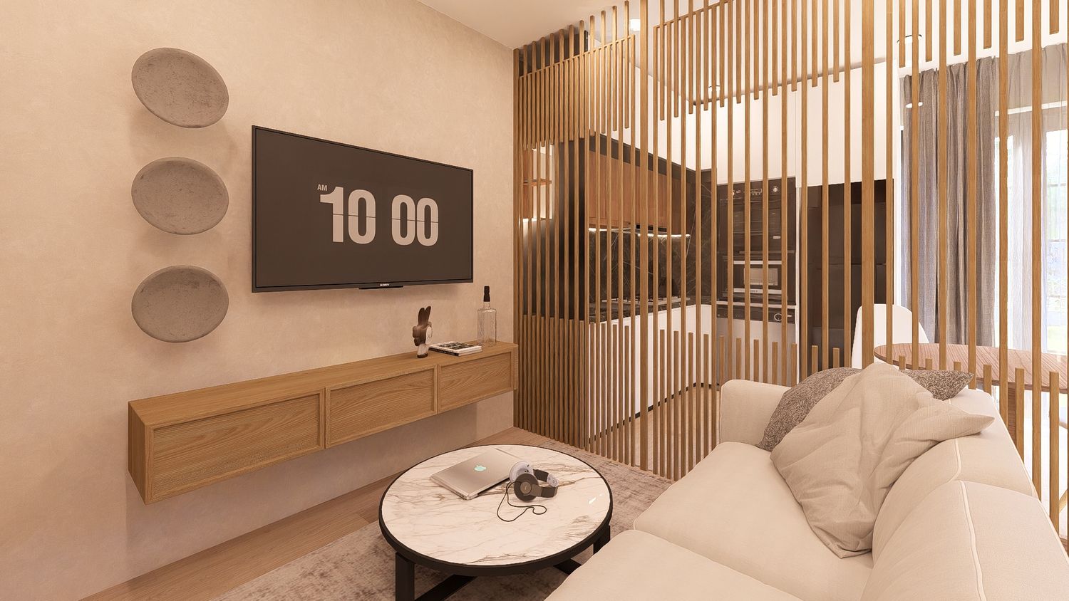 Zona living più raccolta e confortevole, con TV e divano correttamente orientati.