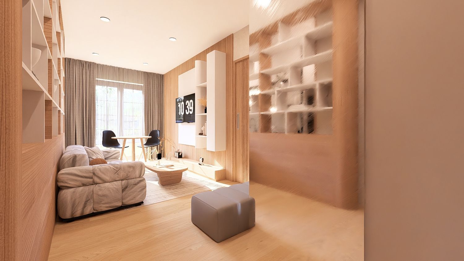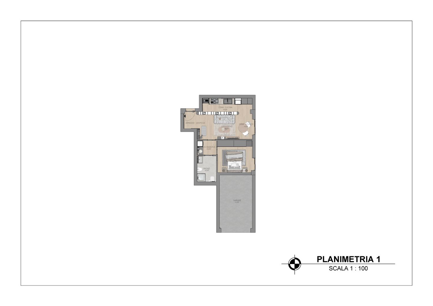 Questa proposta interpreta lo spazio in modo più aperto e dinamico, mantenendo la separazione tra le funzioni ma con una maggiore continuità visiva.