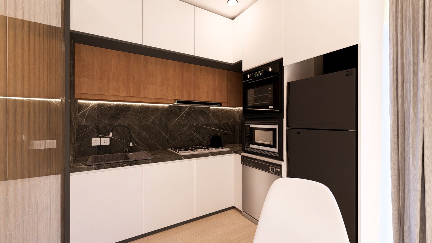 Cucina organizzata in modo lineare e funzionale, completa di tutti gli elettrodomestici richiesti.