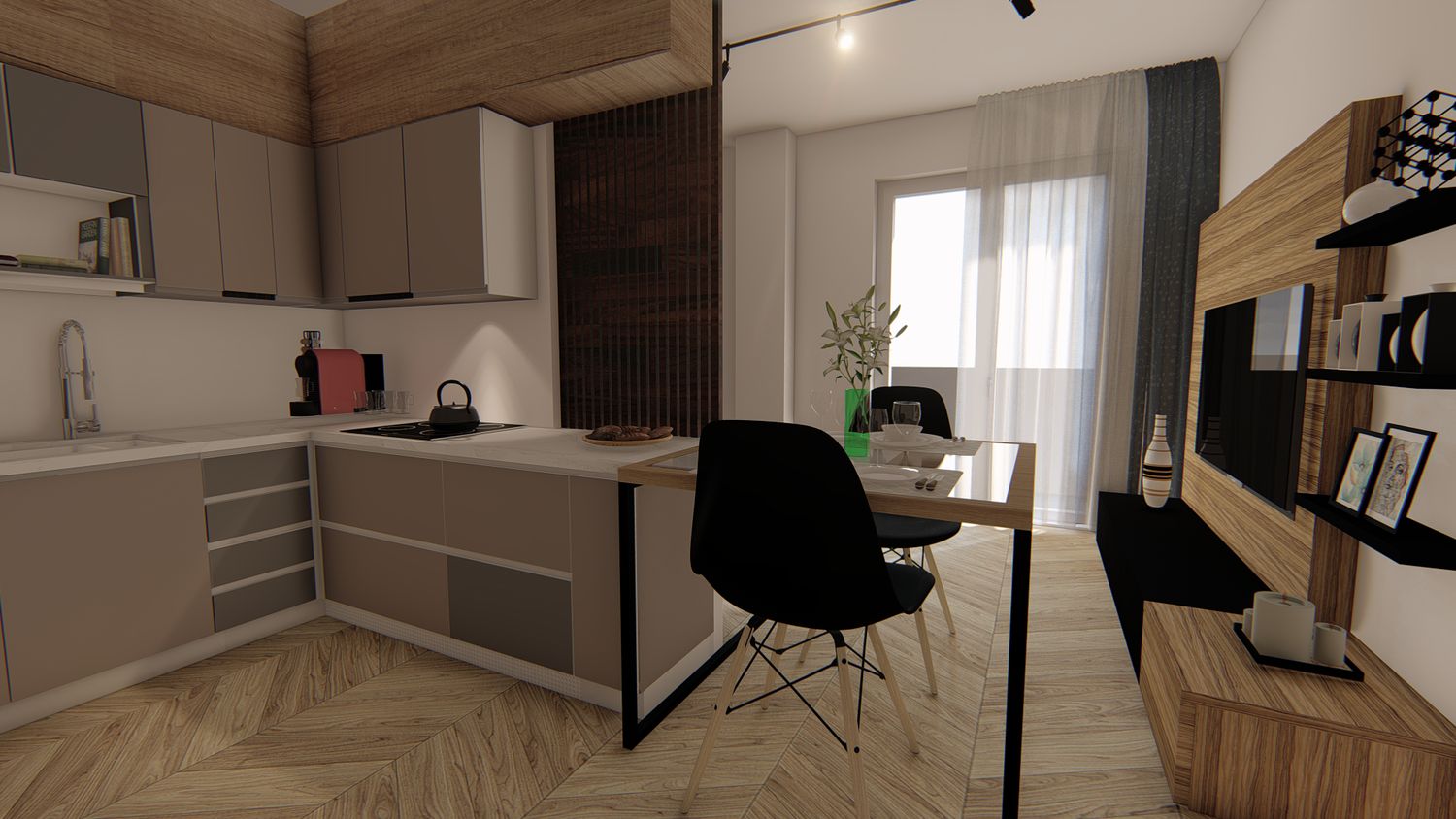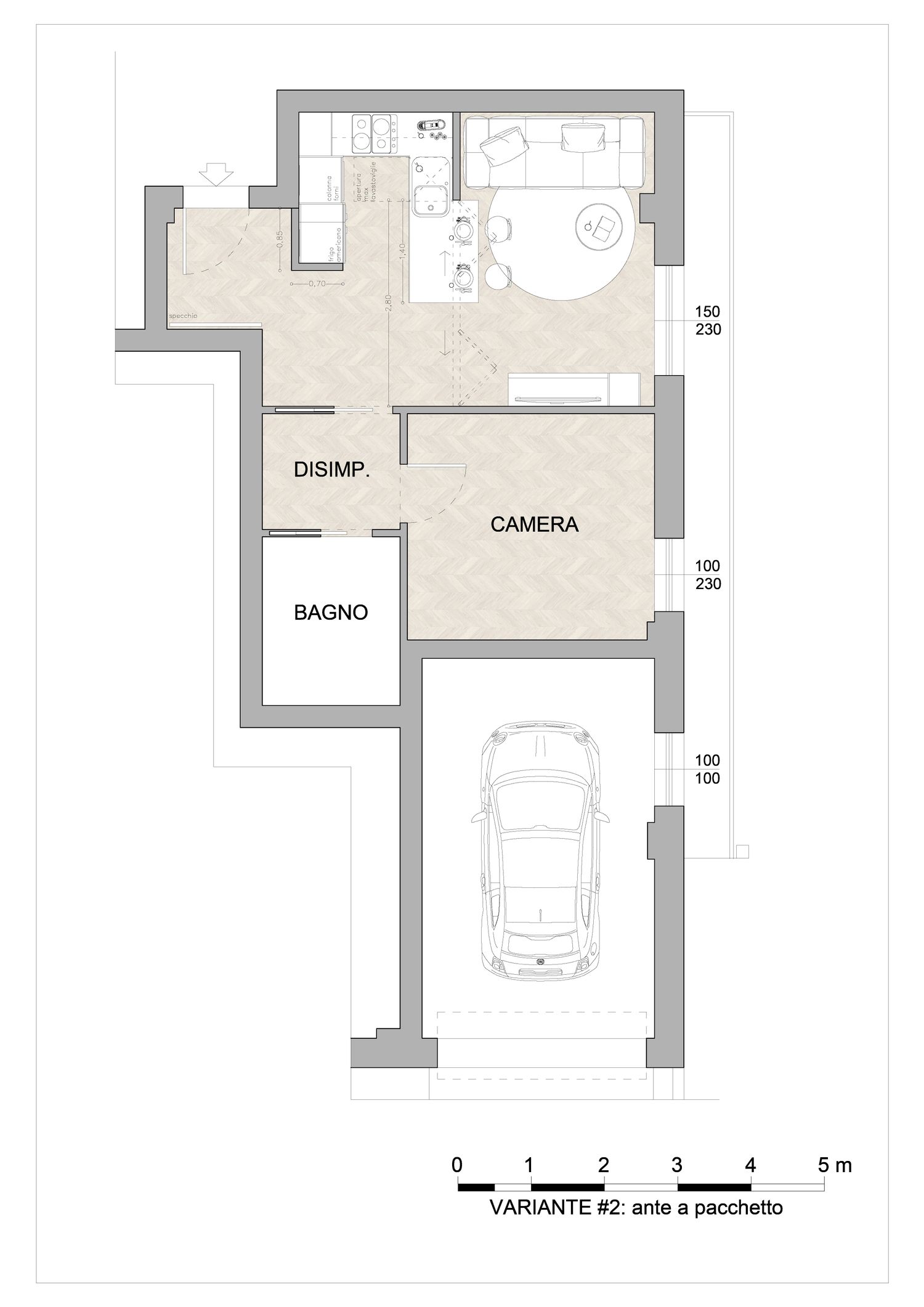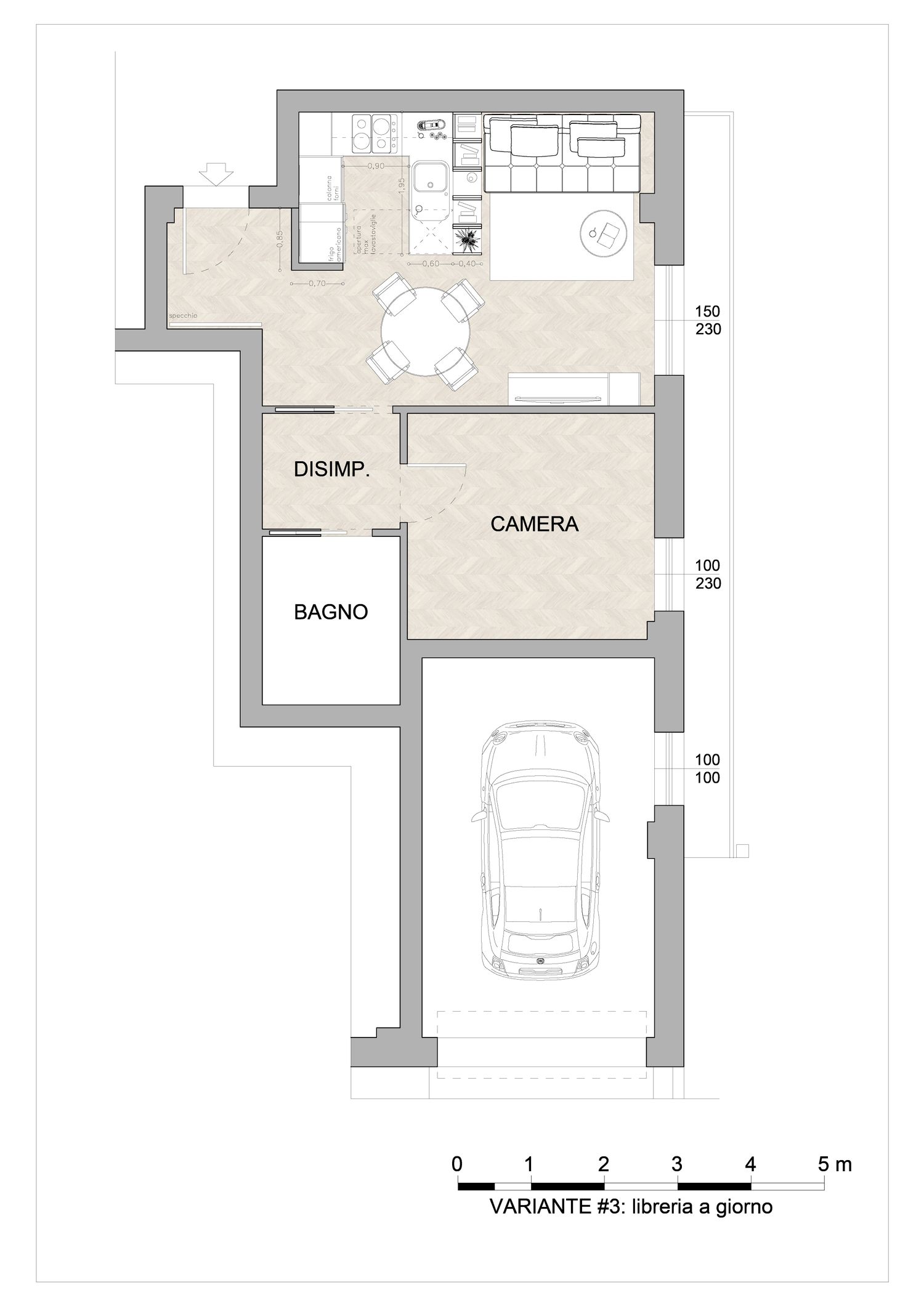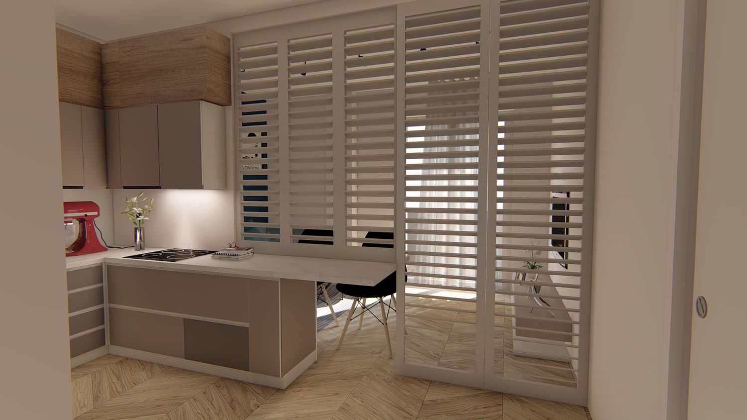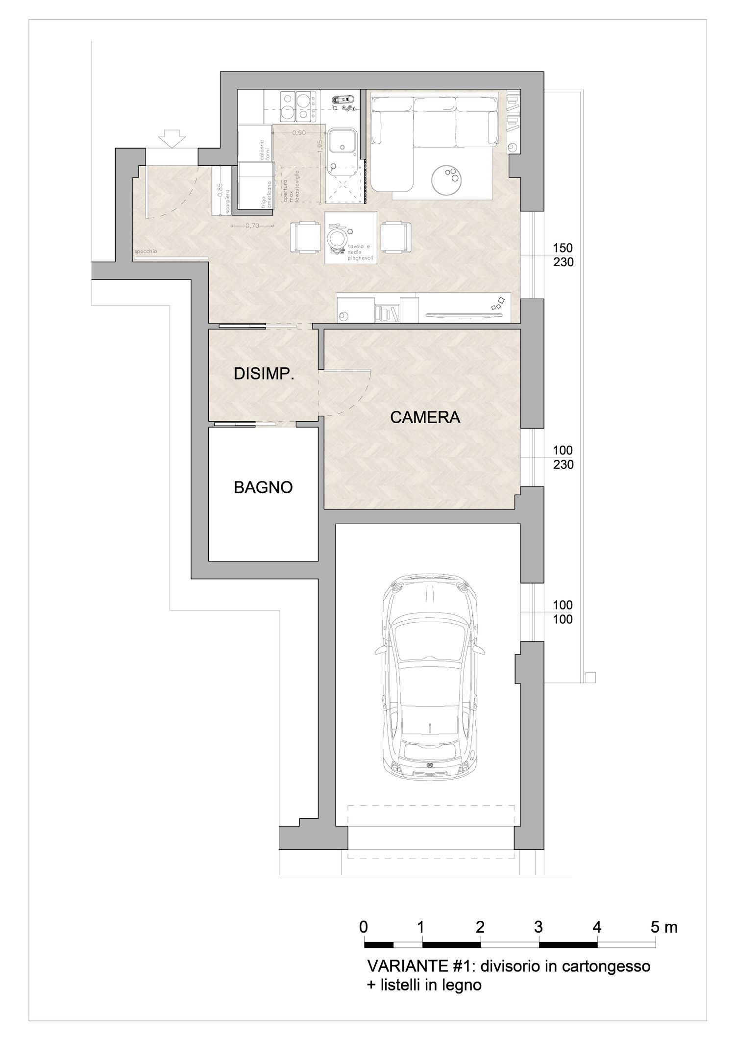 1. parete in cartongesso, chiusa a tutt'altezza per i primi 140 cm dal muro perimetrale, e poi chiusa solo fino al top cucina, e a listelli di legno verticali per la restante altezza. L'area più vicina alla porta finestra diventa lo spazio soggiorno, con divano e mobile TV; completa l'arredo un tavolo da pranzo di dimensioni compatte, eventualmente pieghevole per poter essere chiuso e riposto all'occorrenza. Nell'area di ingresso, viene inserita una scarpiera alta.
