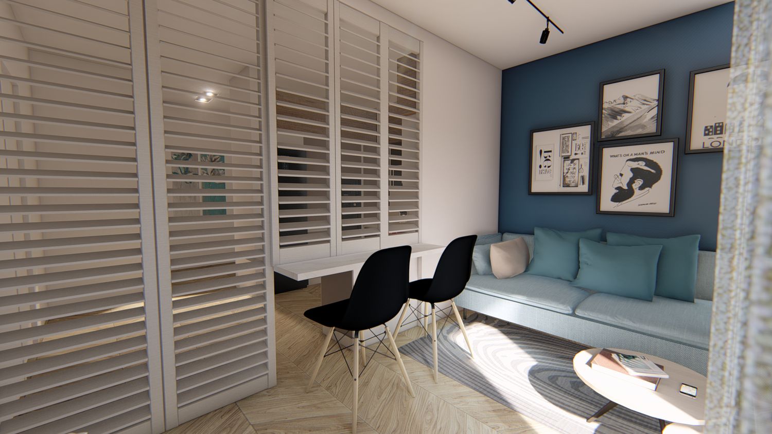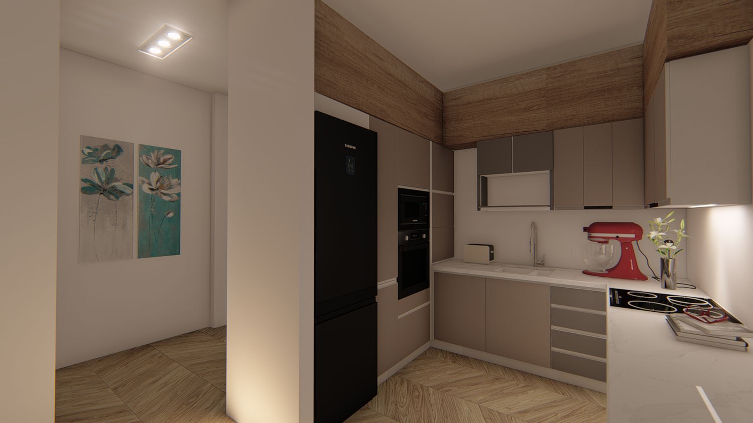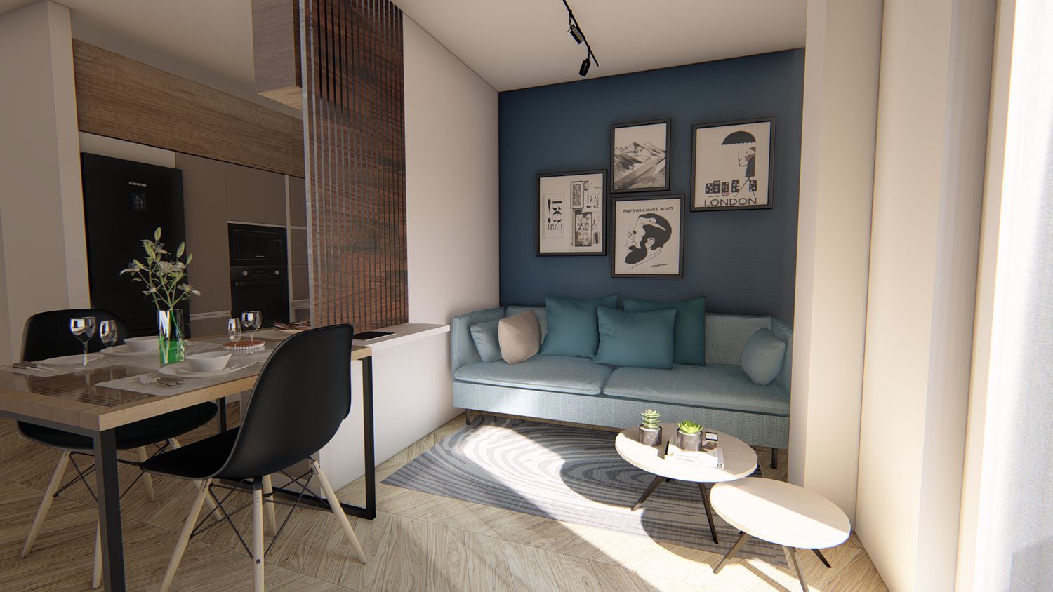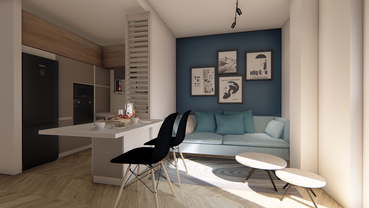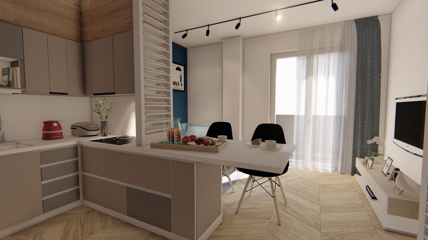1. parete in cartongesso, chiusa a tutt'altezza per i primi 140 cm dal muro perimetrale, e poi chiusa solo fino al top cucina, e a listelli di legno verticali per la restante altezza. L'area più vicina alla porta finestra diventa lo spazio soggiorno, con divano e mobile TV; completa l'arredo un tavolo da pranzo di dimensioni compatte, eventualmente pieghevole per poter essere chiuso e riposto all'occorrenza. Nell'area di ingresso, viene inserita una scarpiera alta.