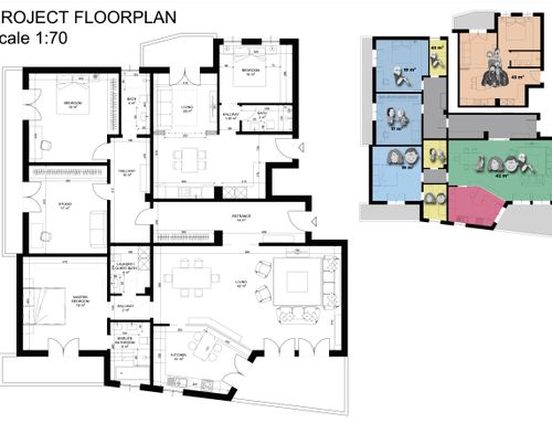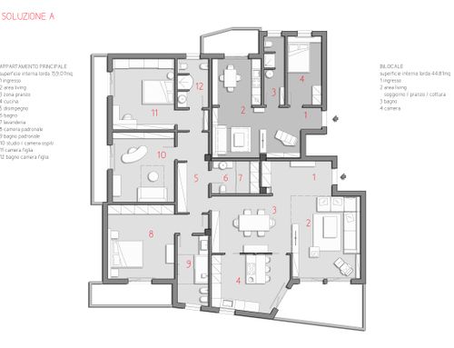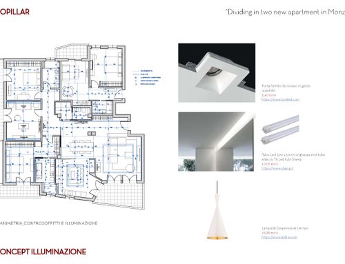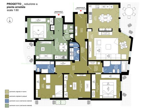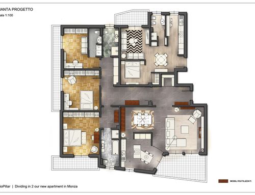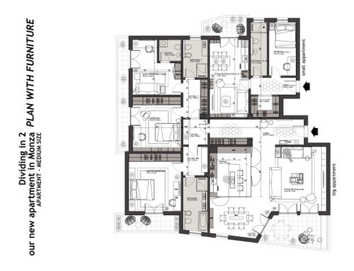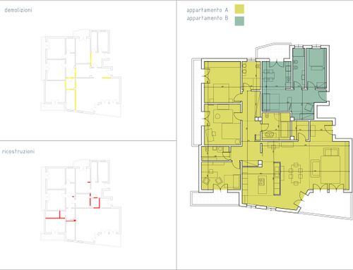 One of the challenges is get the best division minimizing tearing down and bulding up walls, possibly keeping the original marble fllooring for the living room ( for the kitchen also maybe ) and the parquet flooring for the bedroom of the main apartment, while having the small apartment brand new.