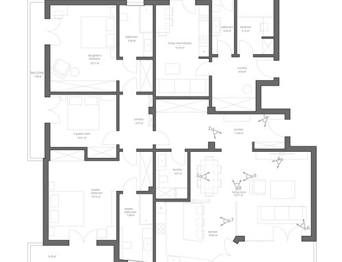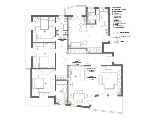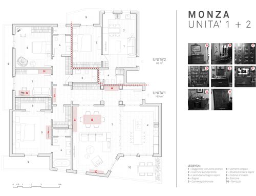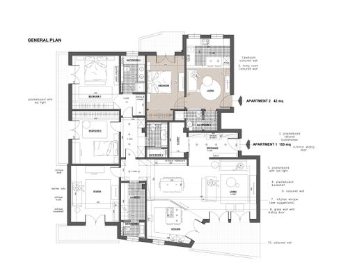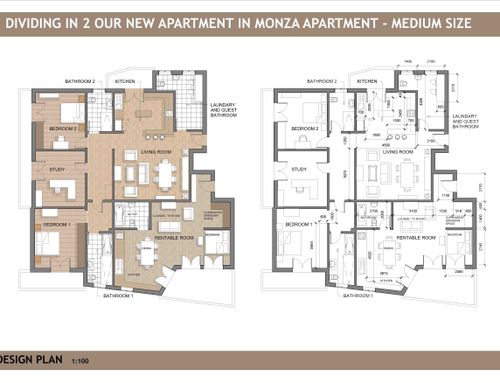 The original apartment shall be renovated and divided in 2 , one main apartment ( around 170 sqm) where we will go living in,  made up of 2 bedooms ( 1 main for me and my wife, and another for our daughter ) 1 studio, 2 bathrooms, 1 small laundry room that could be eventually  used as a guest bathroom  ), 1 living room and the kitchen, that should have some some sort of division from the living room.  One smaller apart ( around 40 sqm) that can be either an open space or a 1 bedroom + 1 living room with the kitchen and 1 bathroom, that we think for short term rentings.