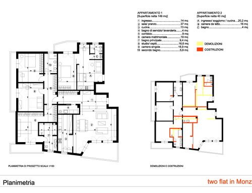 2 camere da letto ( una per noi ed una per nostra figlia ) 1 studio ( anche per eventuali ospiti ) 2 bagni, 1 lavanderia che possa servire anche come bagno per ospiti, sala e cucina, che dovra’ avere una forma di divisione dal salone (  non vogliamo cucina “americana”).  L’appartamento piu piccolo, 40 mq circa, potra’ essere monolocale o bilocale ( camera + sala con cucina e bagno), per 2 ospiti ( al max 4) che pensiamo di affittare probabilmente per brevi periodi.