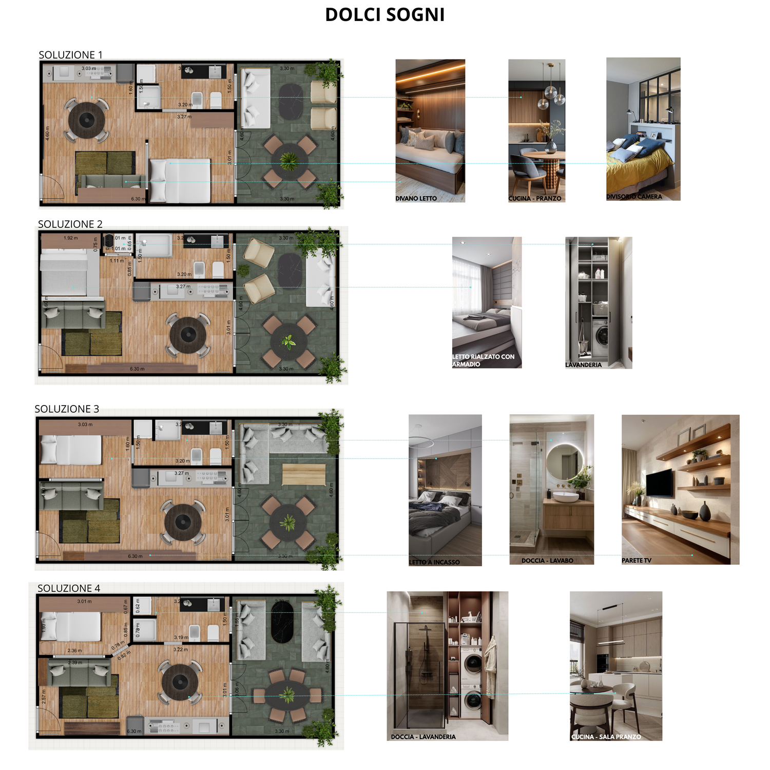Sol. 2 – Ambiente unico con cucina lineare e tavolo rotondo affacciato sul terrazzo; il letto matrimoniale è nascosto da una parete decorativa e rialzato, con spazio sottostante per cassettoni.