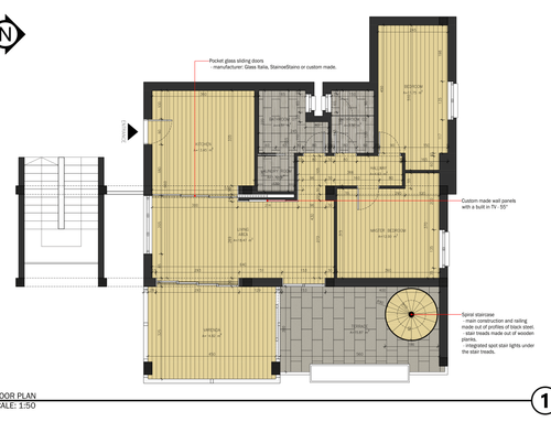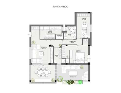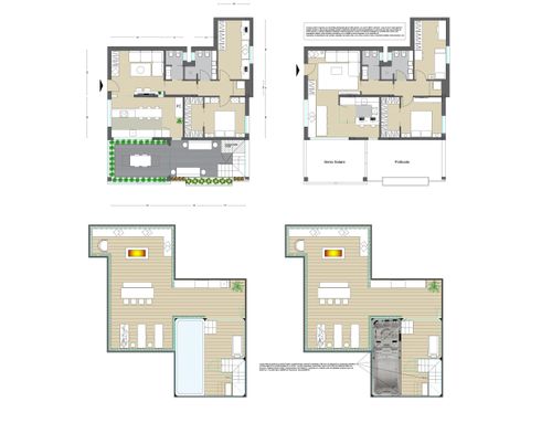 Hello everyone. My partner and I bought a penthouse on paper still to be built. The apartment is on the top floor and consists of 2 units on the first floor, there is the 82 sq m house with solar greenhouse and balcony. The upper floor is all 90 sqm terrace. For the moment we are still two. We both work a lot from home so we need to be perfectly connected. We need a well-equipped kitchen with many support points with the possibility of being able to move easily. Would like to have a Lissoni-style glass closure. Induction cookers and all modern kitchen technologies. White color or in any case light shades. Preferably consider many drawers and shelves. We have many clothes, clothes and shoes. We would like a solution at the entrance of the house to be able to remove shoes and overcoats. We use the treadmill and we do free body activities. We are used to watching TV after dinner on the sofa. Friends and relatives do not come home often, we prefer to go out and go to the beach whenever possible. We have always liked a large terrace that can also be enjoyed in winter, we would like it very green, we imagine a masonry perimeter with plants and a possibly wooden floor but also any congenial solution. We would like a large tub on the terrace and a shower. We are open to any idea we have no foreclosures. I enclose a simulation made by me (so don't pay attention to inaccuracies). Thank you very much. good job