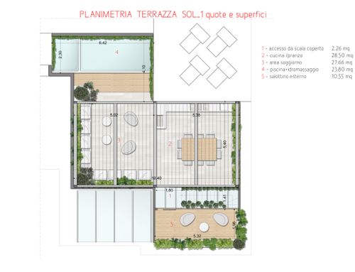 06/07/2020: CI piacerebbe avere una vasca con nuoto controcorrente sul terrazzo. Ci piacerebbe avere , all'uscita della scala esterna che da sul piano superiore, una copertura affinchè non piova sulle scale e dia la possibilità di salire anche con la pioggia. Abbiamo visto che esistono dei moduli ad induzione per cucinare pertanto si potrebbe pensare di avere una vera e propria cucina sul terrazzo. Ringrazio molto