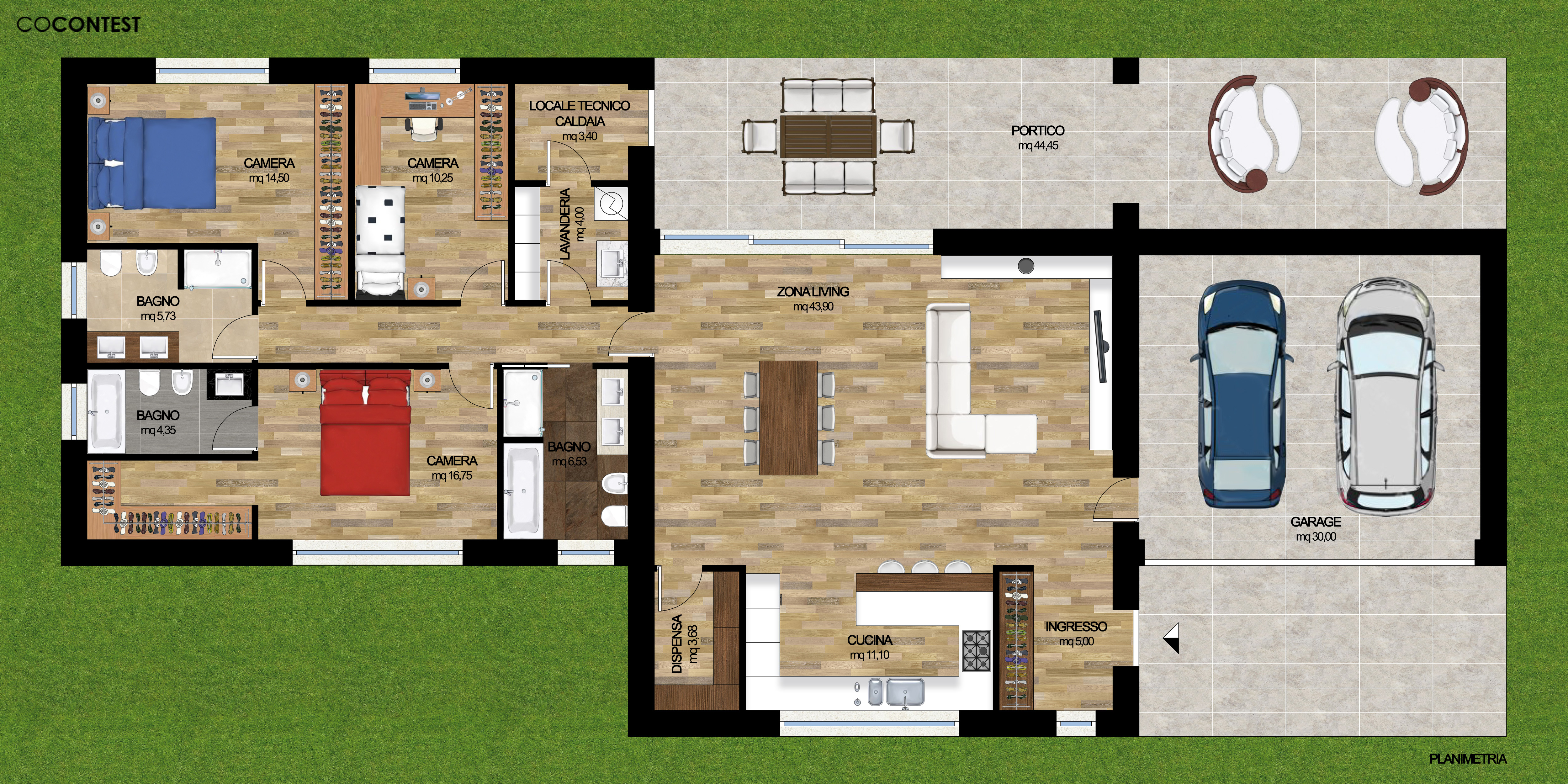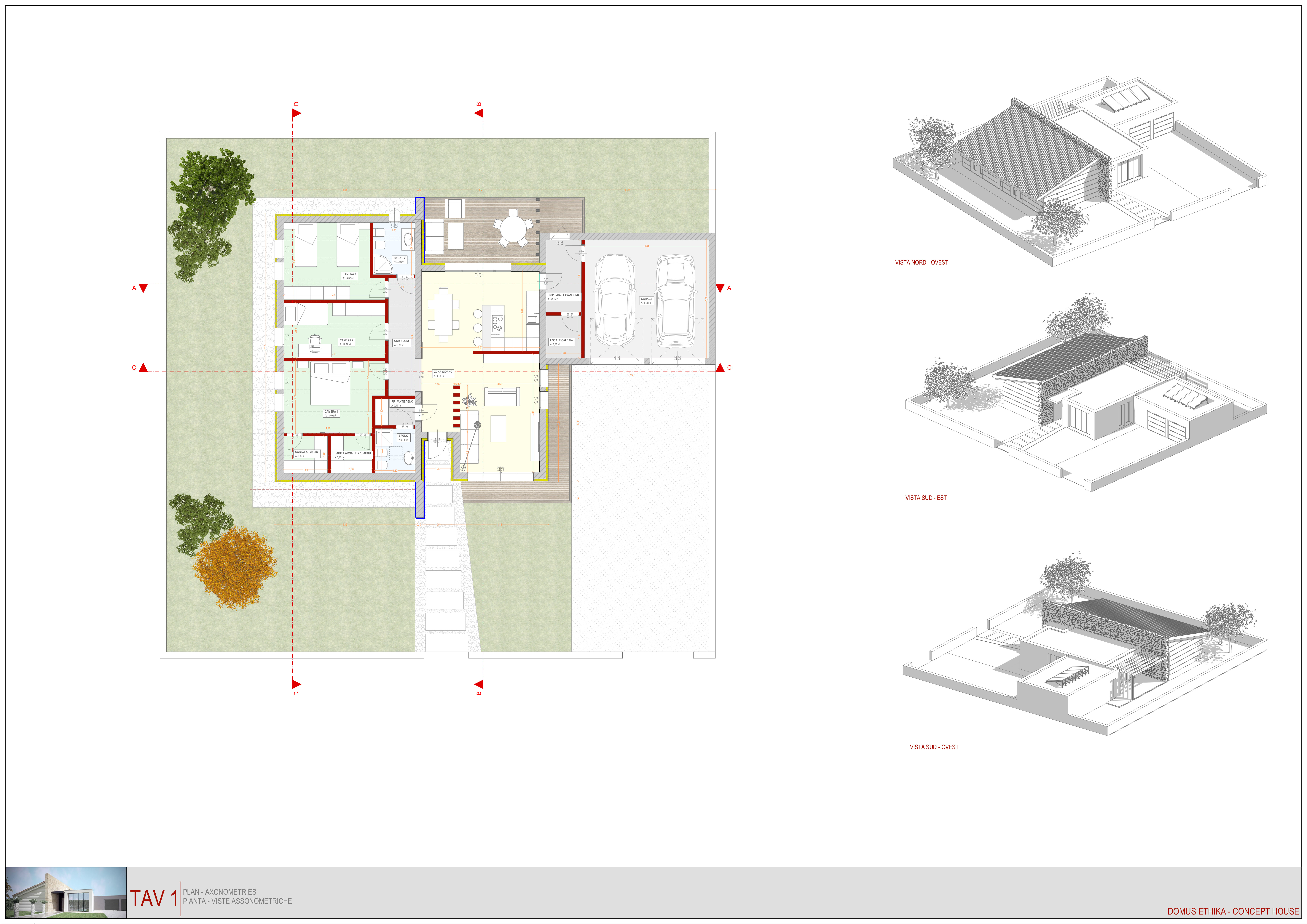 Non ho volutamente inserito le dimensioni del lotto perché il prototipo dovrebbe essere il modello di casa unifamiliare in una lottizzazione in cui sono presenti lotti di metratura differente in un range tra i 700 e i 1000 mq. La cubatura è di 1100mc e i garage fuori terra non sono conteggiati.