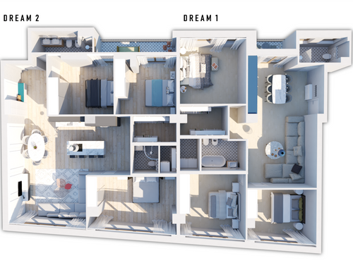 The minimum RENDER views required are on the living area, bathroom, and north balcony solution.