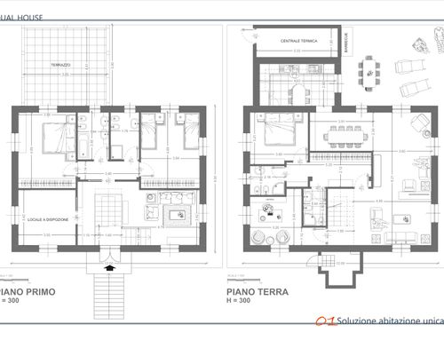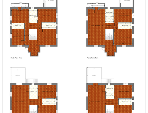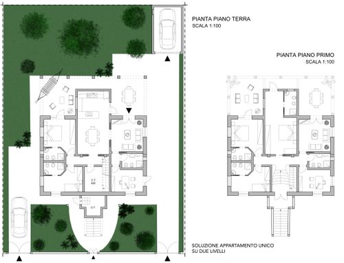 Ristrutturazione integrale, con rifacimento del livello dei piani. Obiettivo: Suddividere lo spazio interno in modo che la villa sia frazionabile in due appartamenti. Complessivamente almeno tre camere da letto, ciascuna con bagno, con possibilità di ricavare una quarta al momento del frazionamento (2+2). Al momento la pianta della casa è rettangolare, mt 9x12 oltre a garage esterno di mt. 3,5x5,5. È possibile un ampliamento di 12 mq per piano sul retro, collocabile dove si vuole. Possibile terrazza calpestabile al primo piano. Occorre prevedere uno spazio per centrale termica adiacente la casa, che non rileva ai fini della superficie ammessa fino a 10 mq. Il prospetto di facciata non è modificabile e, quindi, è necessario prevedere alcuni gradini interni per collegare il pianerottolo di arrivo della scala esterna con il piano di calpestio del primo piano. Altezza max fabbricato mt. 6,60. Rafforzamento strutturale previsto mediante montanti e travi in acciaio.