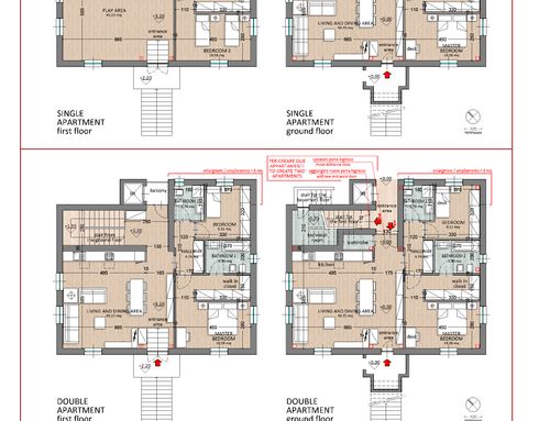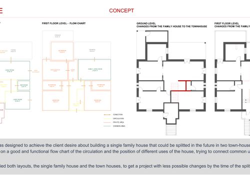 The main goal of the Contest is to design the internal distribution of the space so that the house could be split into two in the future. In total, we need at least 3 bedrooms with an en-siute bathroom each and we need the possibility to create a fourth bedroom when the house will be split (2+2).