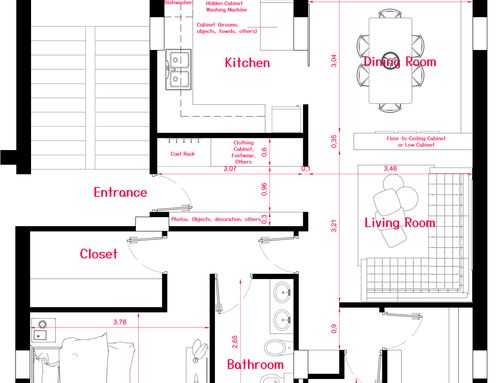 I still don't know where to put the washing machine and dry brooms and rags. I was thinking of making a closet from the child's room (the one with the big bed at the bottom right), shortening it.