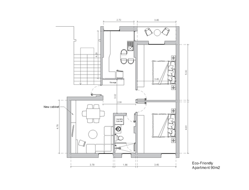 Todavía no sé dónde poner la lavadora y las escobas y trapos secos. Estaba pensando en hacer un armario con la habitación del niño (el que tiene la cama grande abajo a la derecha), acortándolo.