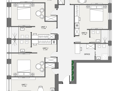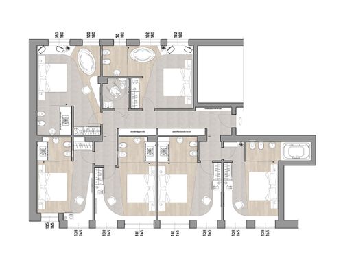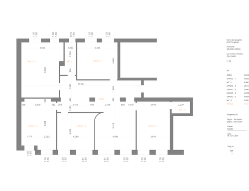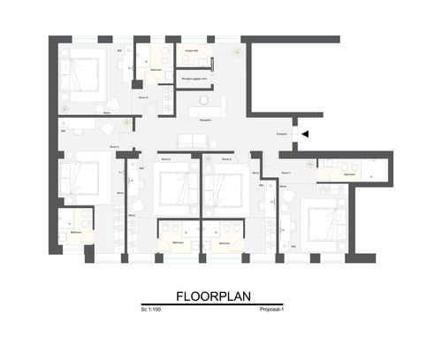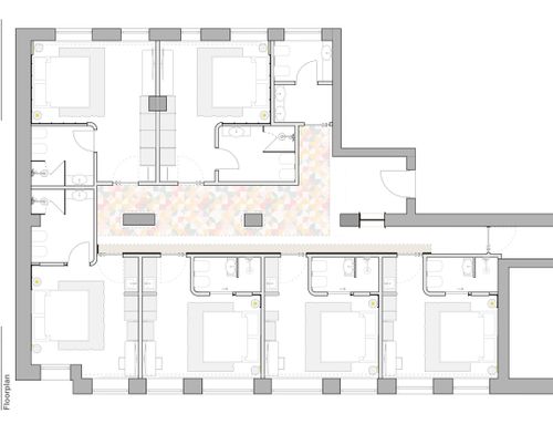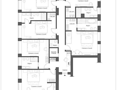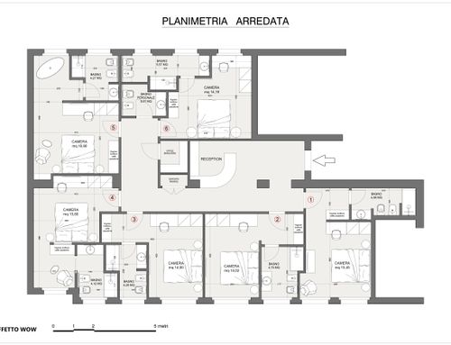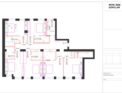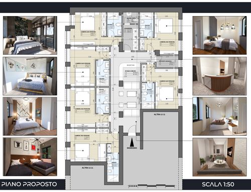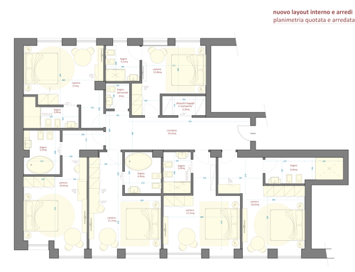 nello spazio preso in locazione vorremo realizzare un piccolo affittacamere con un massimo di 6 camere. tutte le camere dovranno essere dotate di bagno privato e bisogna prevedere un bagno comune da far utilizzare agli ospiti ed al personale. bisognerà prevedere una scaffalatura o qualcosa di simile a disposizione degli ospiti per depositare i bagagli. gli spazi si trovano al piano rialzato in una piccola stradina in una delle più belle zone di Milano: Brera.