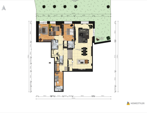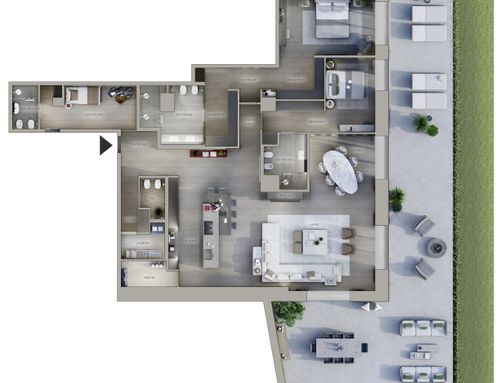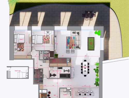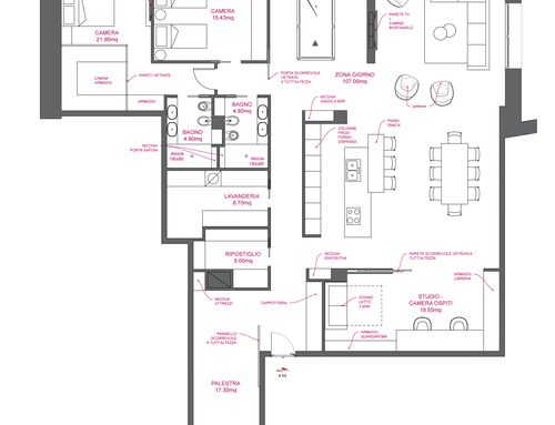 vorrei ottenere un appartamento molto moderno e minimal, con stanze ampie e spazi comodi, sfruttando la zona vetri per un grande salotto luminoso con un grande divano e zona Tv, e anche un tavolo da biliardo.