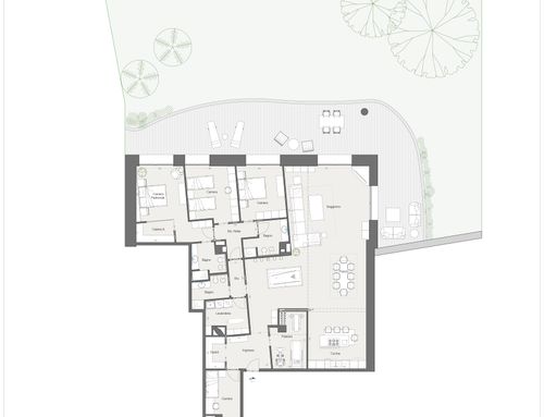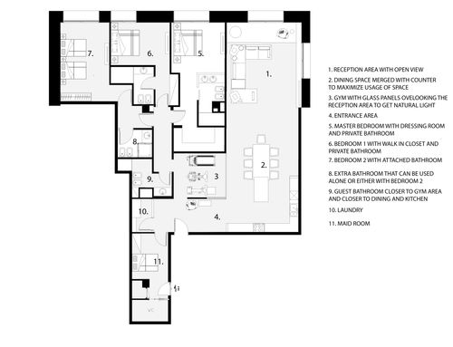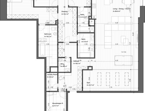 I would like to get a very modern and minimal apartment, with large rooms and comfortable spaces, taking advantage of the glass area for a large bright living room with a large sofa and TV area, and even a pool table.